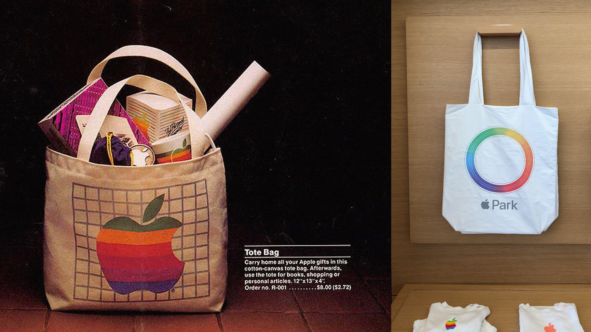Rounding out this fall’s offerings are modern designs with the text “APPLE PARK CALIFORNIA 95014,” referencing the company’s address, and others with the word “California” stylized to show the letter O as Apple Park’s ring. Other merchandise like caps, cards, and tote bags don’t appear to have been updated yet, but could follow. Personally, I’d like to see 1983’s tote bag design make a comeback: