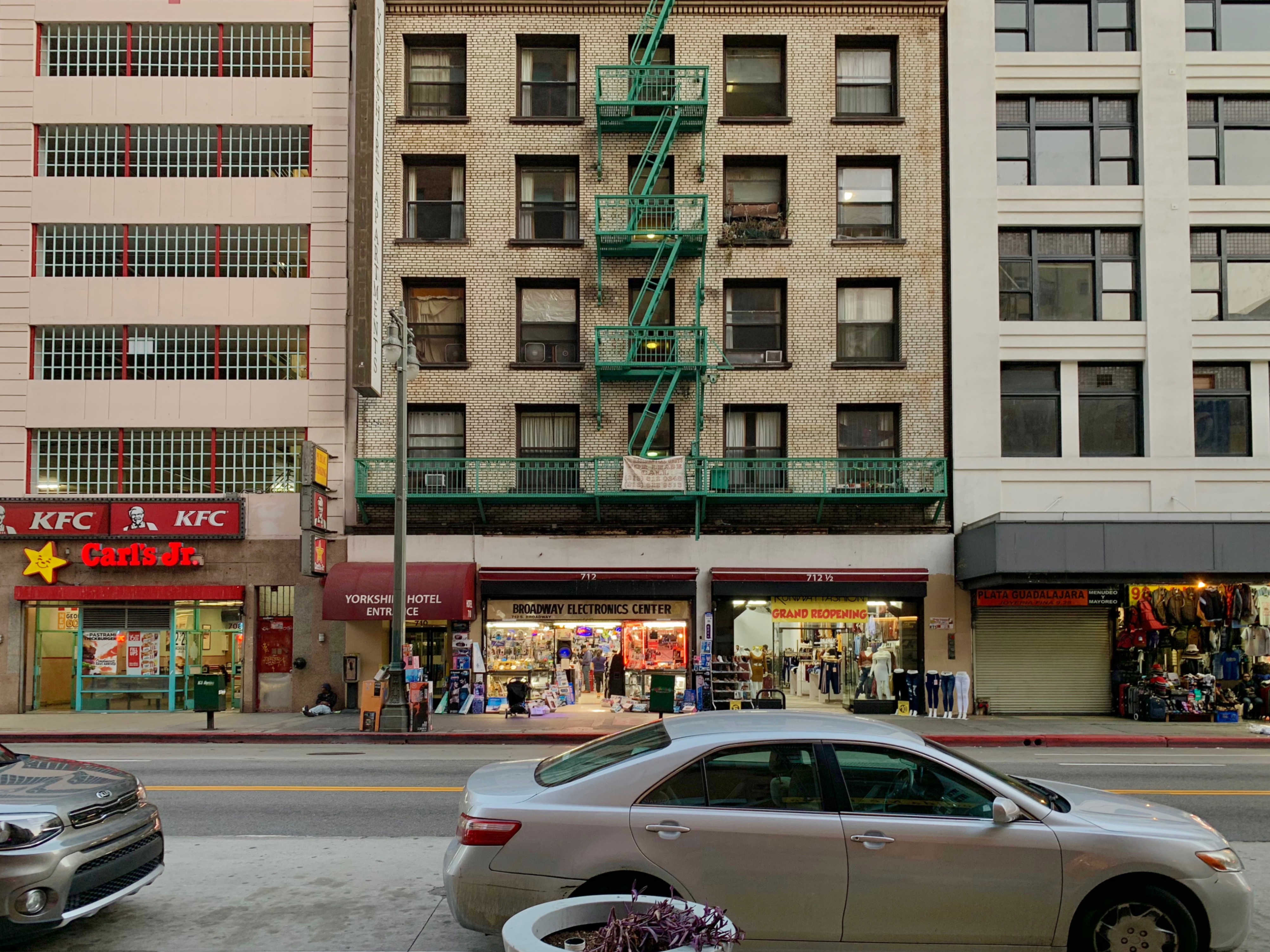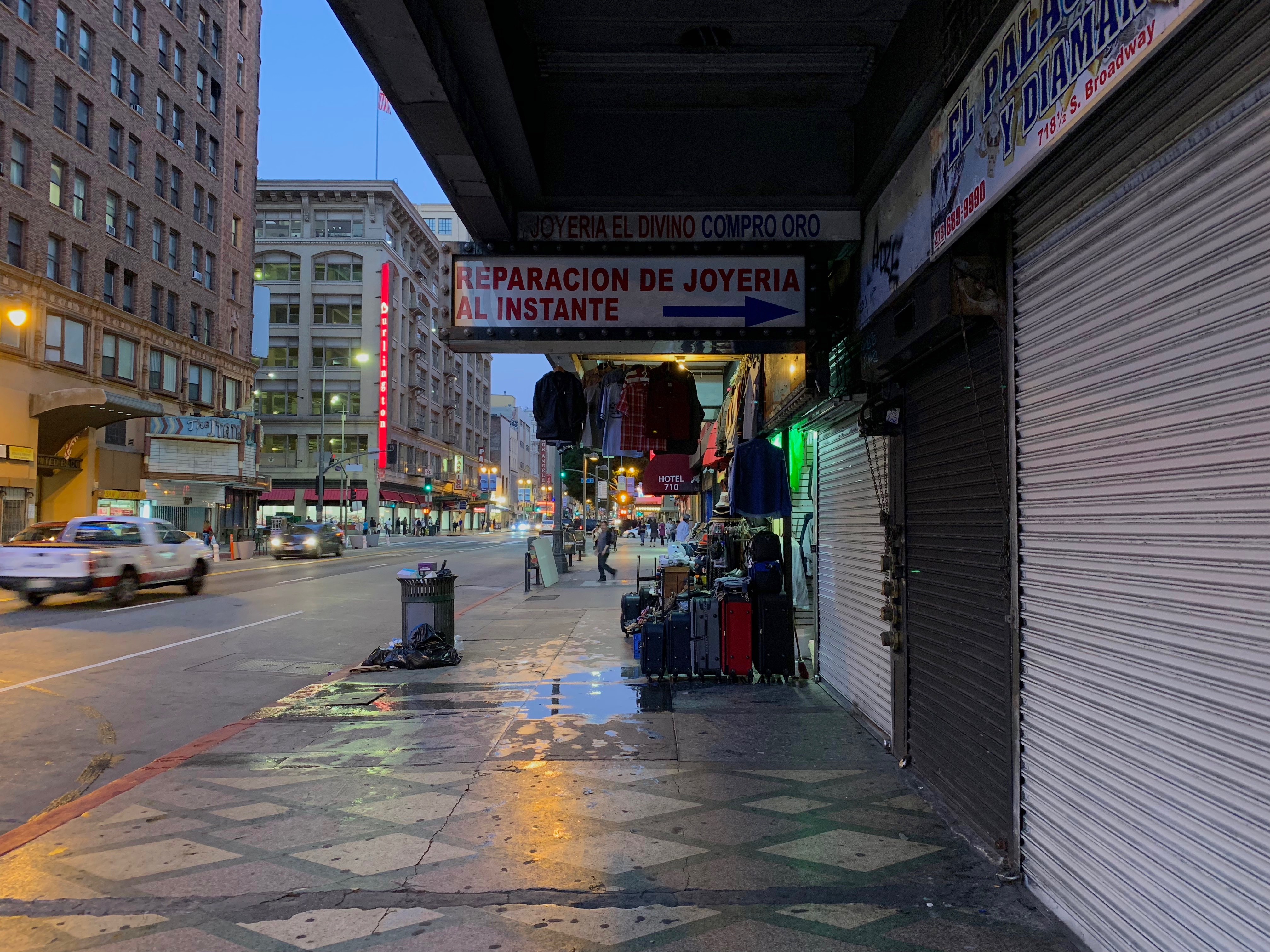 Bordering downtown’s Jewelry District, many of the surviving stores near the Tower are locally owned jewelers and mom-and-pop shops. As I walked the blocks in the early evening, the community’s diversity was fully on display. Covered grocery carts tucked in shuttered doorways were a sharp reminder of those less fortunate. Shop owners were sweeping up and closing their doors for the night. Neon-lit theaters were bustling with activity as patrons lined up.