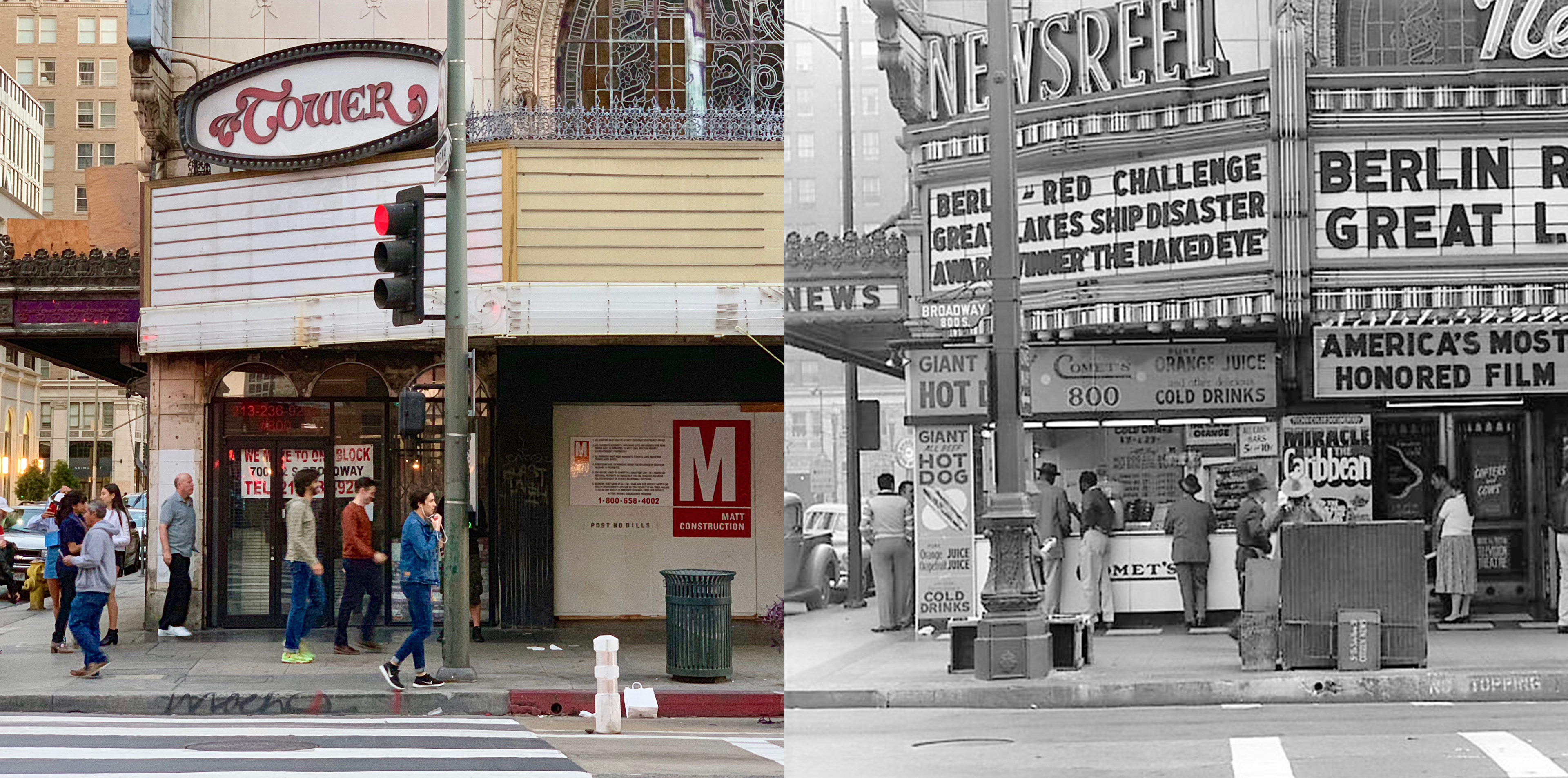 The Tower Theatre today and in 1950 as the Newsreel Theatre. (Archival photo: Los Angeles Theatres)
