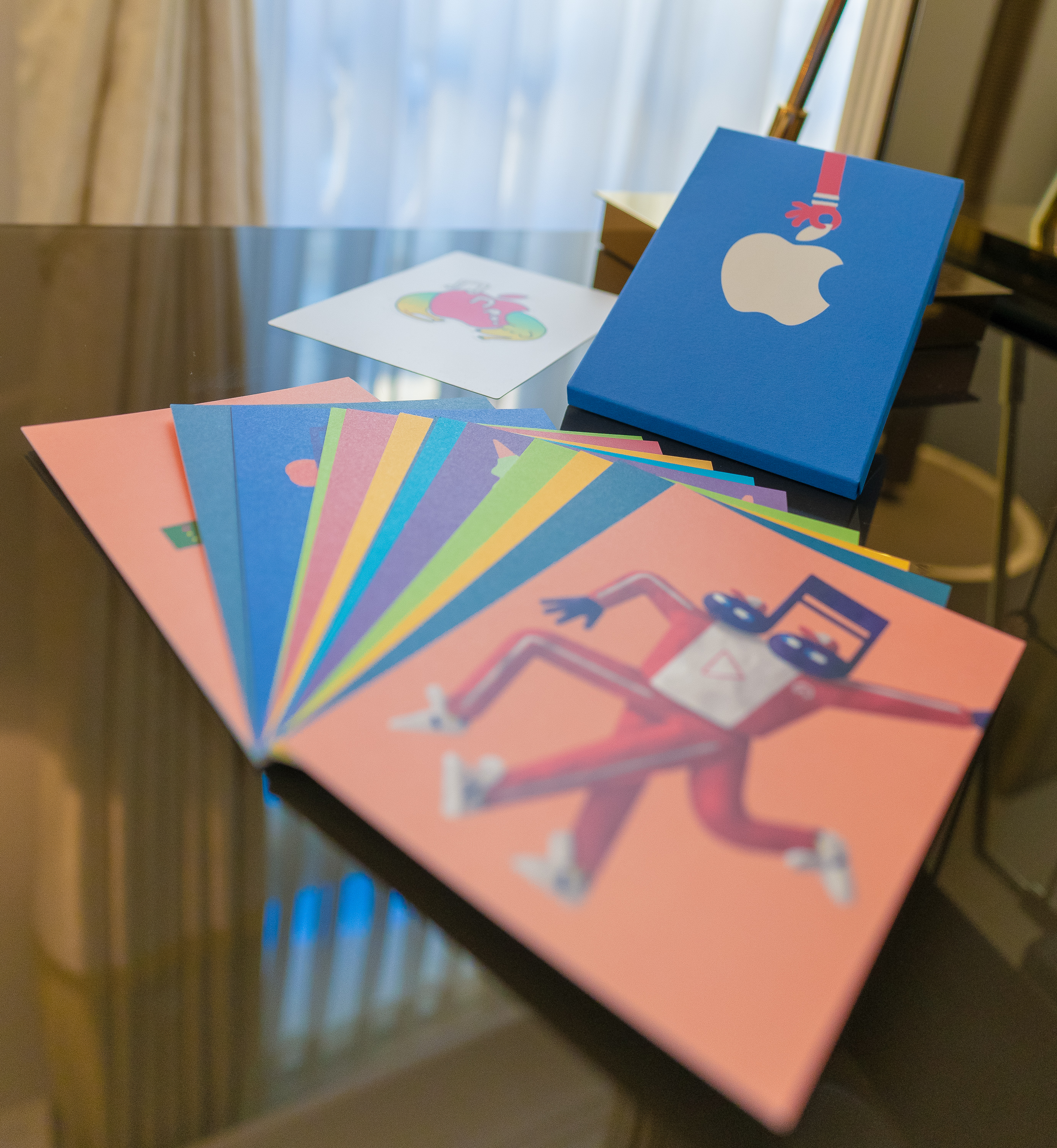 A store of this magnitude offers some unique design details of it own. Seemingly endless hallways lined with parquet flooring lead to tastefully decorated rooms filling the cavernous building with surprises around every bend. Product tables are lit by center mounted LED lamps, found elsewhere only at Apple Grand Central and Apple Cotai Central. Where aviation pioneer Alberto Santos-Dumont once made his home, Apple has replicated a Parisian apartment to create an “Experience Room” for customers to see how Apple’s home products can fit in their lives. HomePods dot the tables throughout the room, and an Apple TV is displayed in front of a living room set complete with a copy of Designed by Apple in California on the coffee table.