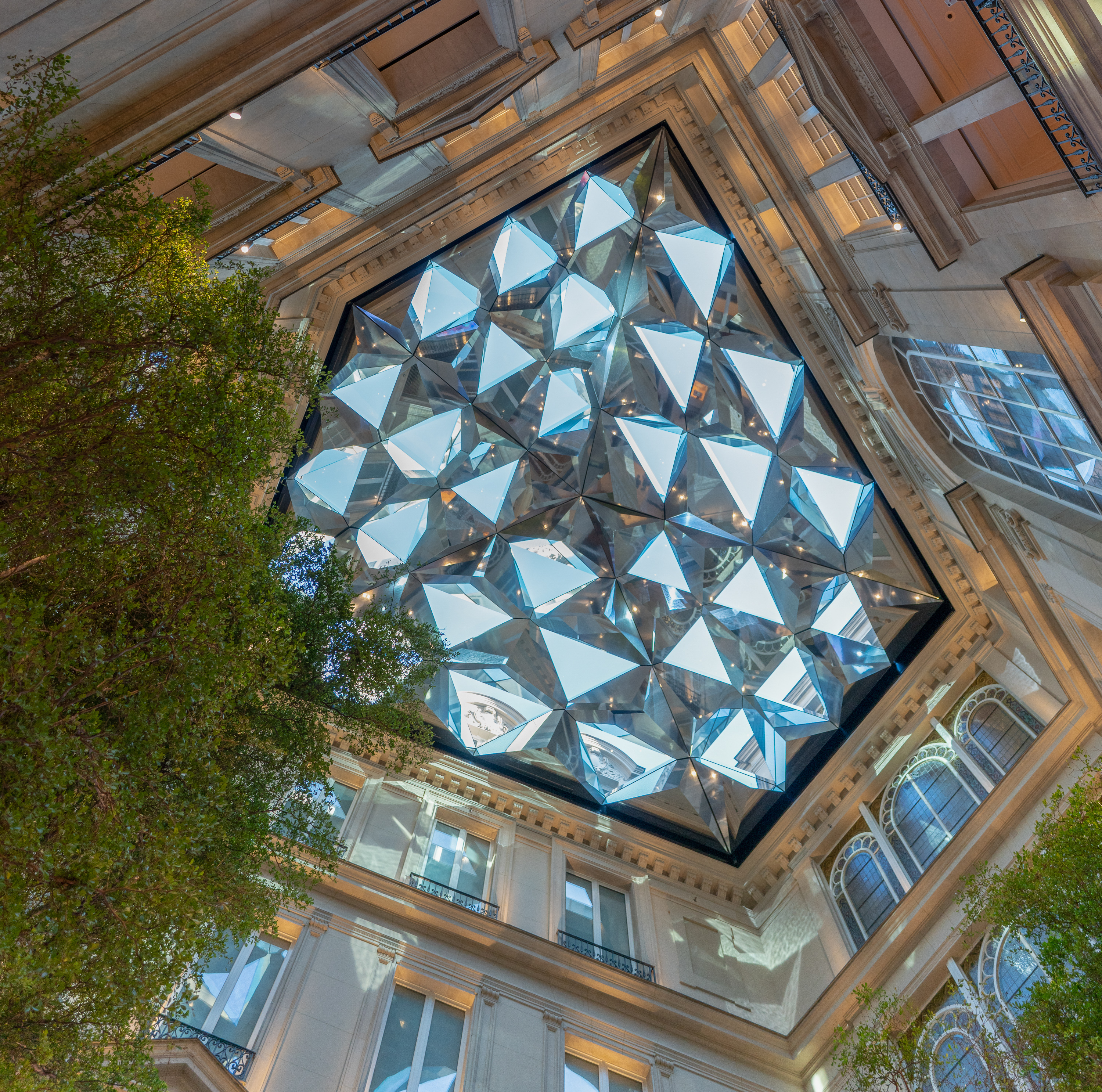 While the building’s retail space is impressive in its own right, the crown jewel of Apple Champs-Élysées is what SVP Angela Ahrendts calls “Europe’s grandest Forum.” At the center of the store, a pentagonal courtyard extends to the sky, almost appearing to be carved out of the building’s core. At a dizzying height, a reflective skylight fills the void created above the Forum, allowing natural light to stream down through angular passages. Photovoltaic panels and a rainwater collection system are integrated to generate renewable energy and provide recycled water for the store. Below, six trees shade an 8K Video Wall.