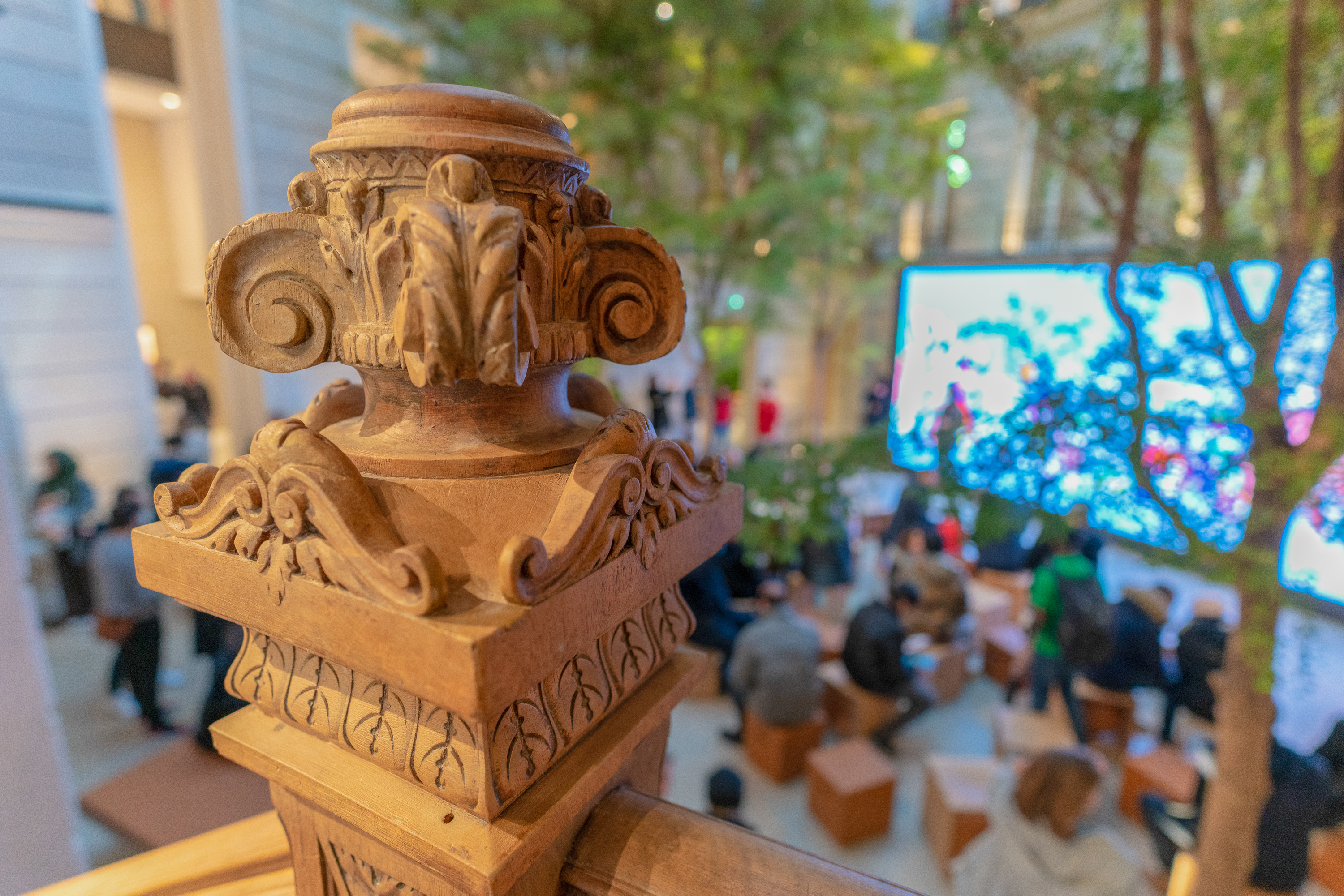 Inside, Apple has transformed the labyrinthine space into a multi-level showroom with intricate rooms and passageways to explore. Wood and marble staircases ascend past delicate leaded glass windows. Smooth stone walls are dotted with Avenue display cases overlooking glass railing-adorned balconies. A bust of the building’s architect still resides over a door frame. An ornate fireplace is juxtaposed with the clean lines of Forum seating.