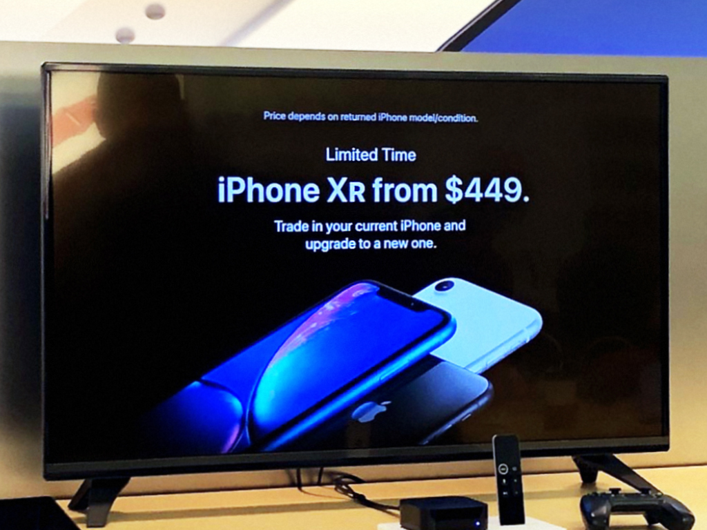 Starting this week throughout U.S. stores, Apple co-opted its Genius Bar Displays in classic locations, Apple TV demos, and Today at Apple Forum Displays to promote iPhone XS and XR deals. Rolling out Wednesday, animated video demo loops play on the displays, followed by text similar to Apple’s online copy: “Limited Time. iPhone XR from $449. Trade in your current iPhone and upgrade to a new one.” While Apple has used similar wording for in-store promotion of its Back to School offer, the advertising has traditionally been limited to desktop wallpapers on display Macs.