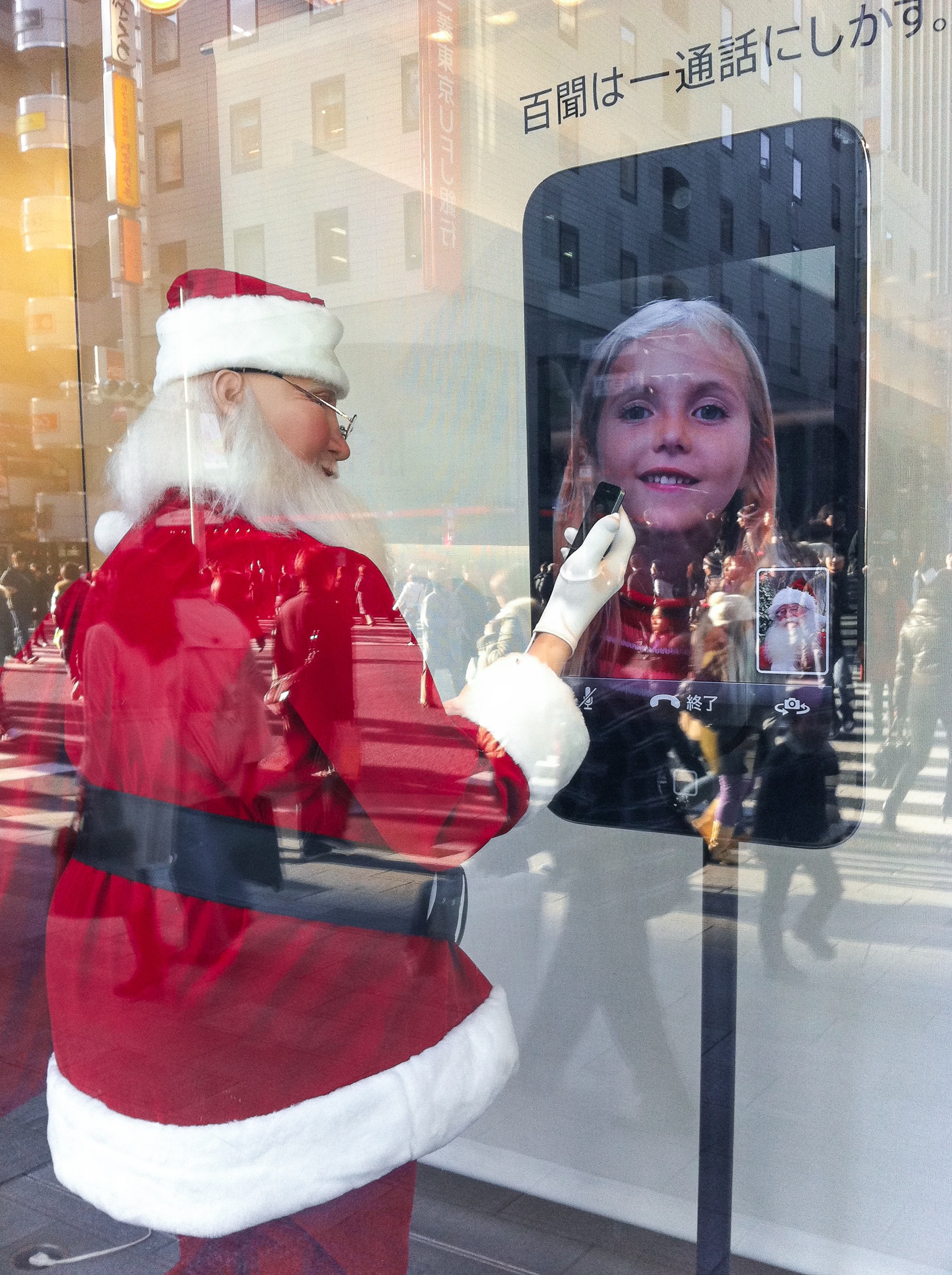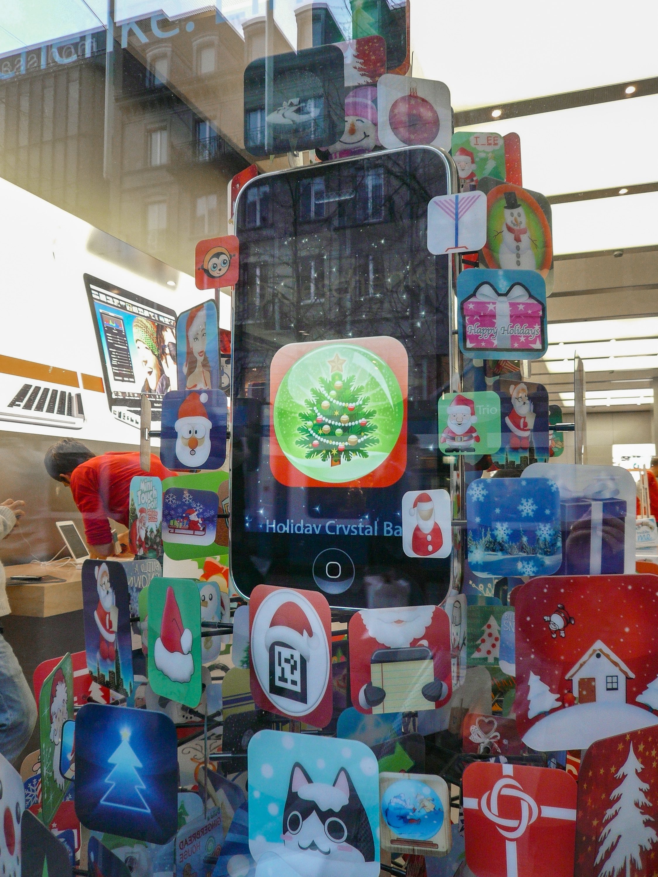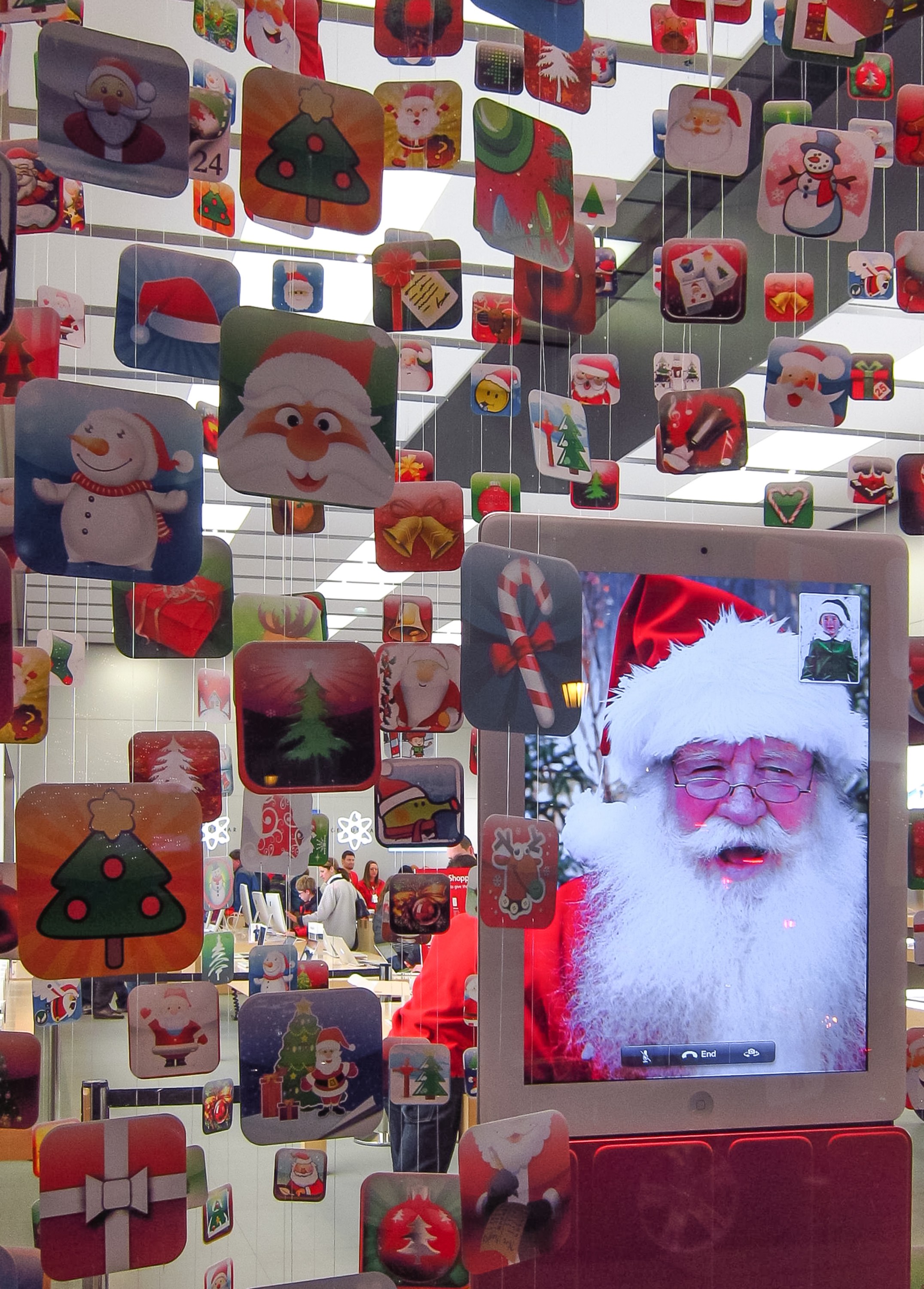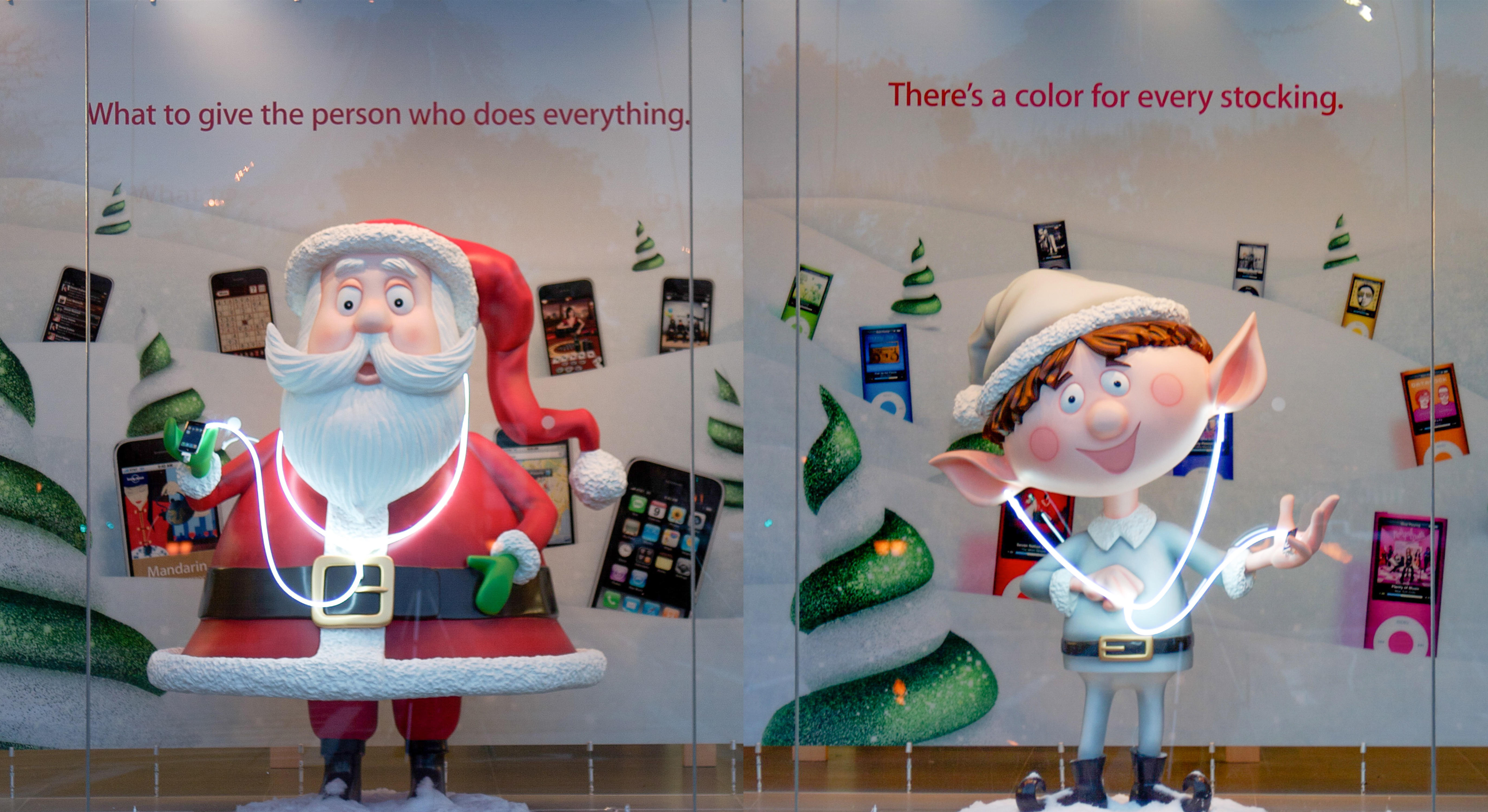 For the iPad’s debut in a holiday display, Apple depicted the tablet inside a massive snow globe. A life-size model of Santa, iPhone 4 in hand, demoed FaceTime.