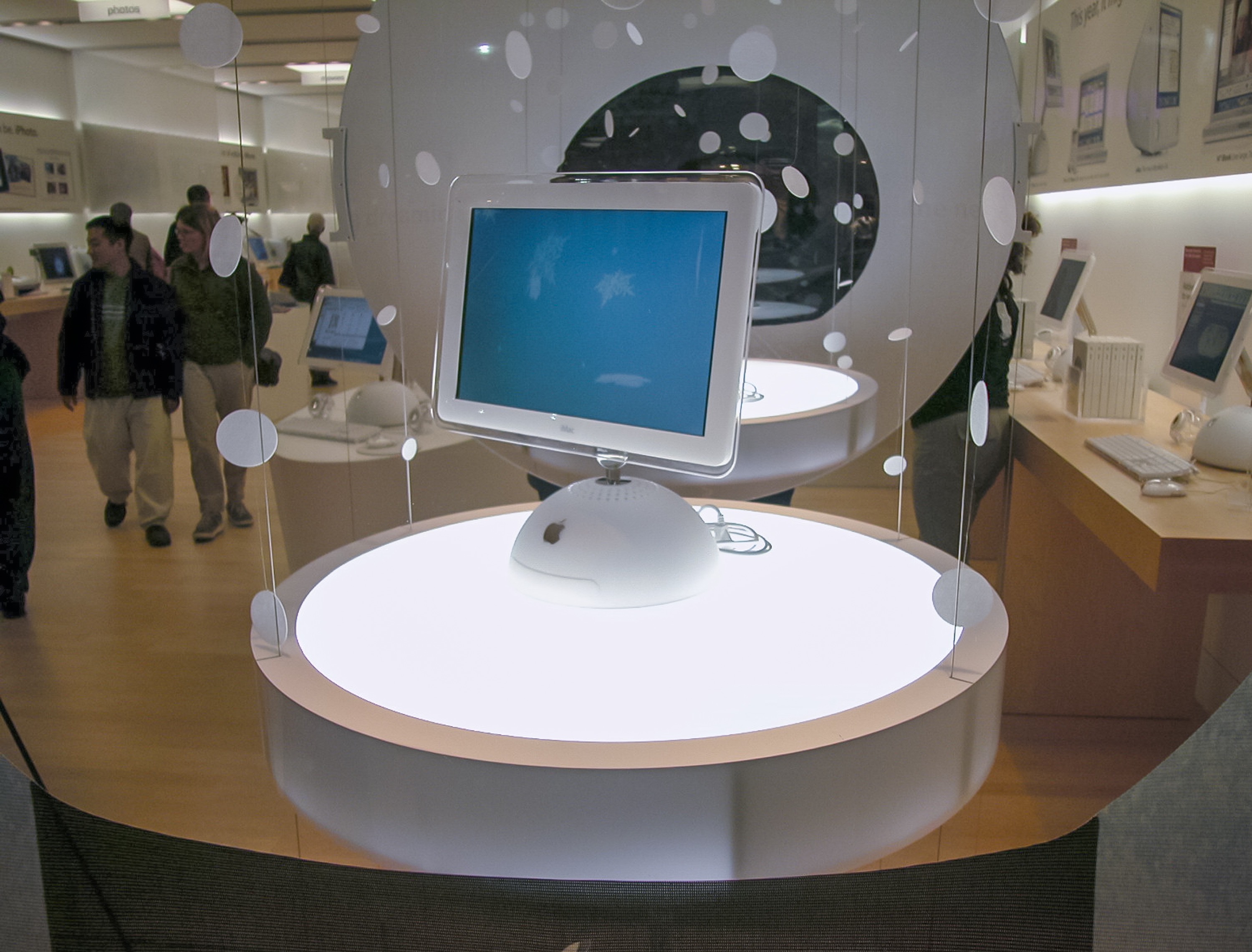 During Apple’s second holiday season in retail, the iMac G4 stole the show. One display featured the desktop in a snow globe surrounded by snowflakes on a lighted pedestal. Another included a model of a gigantic digital camera, positioning the iMac as the hub of your digital life.