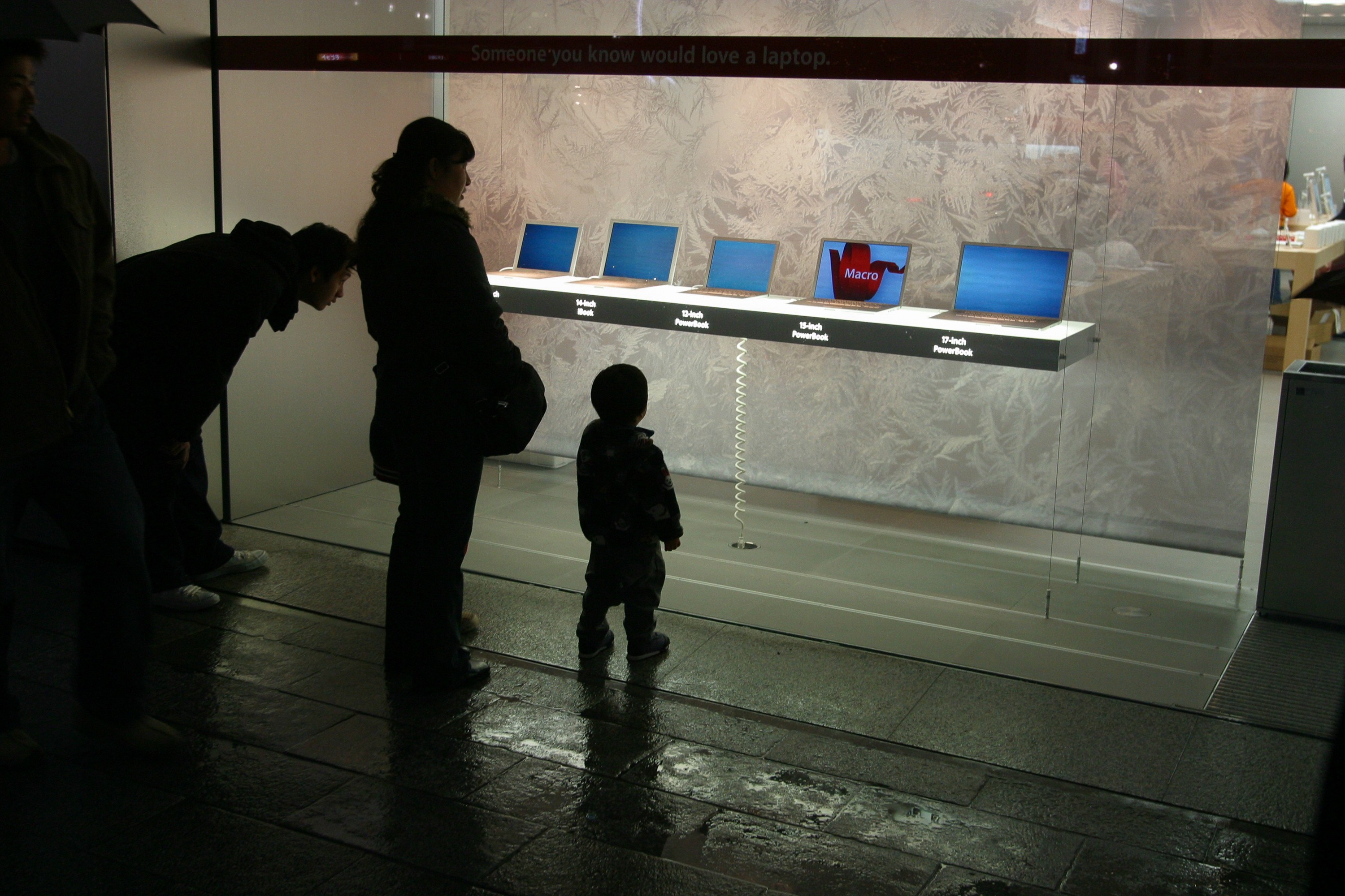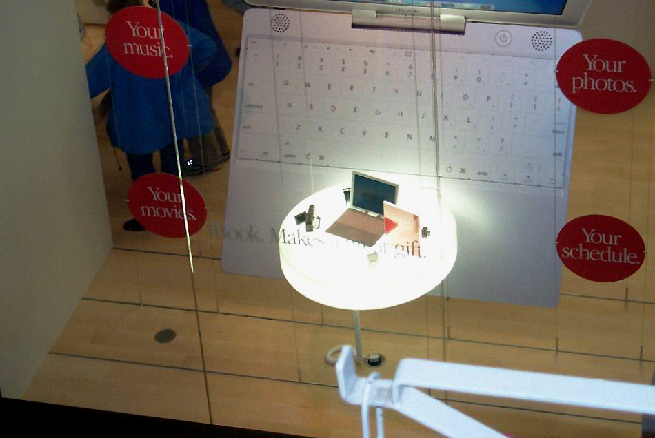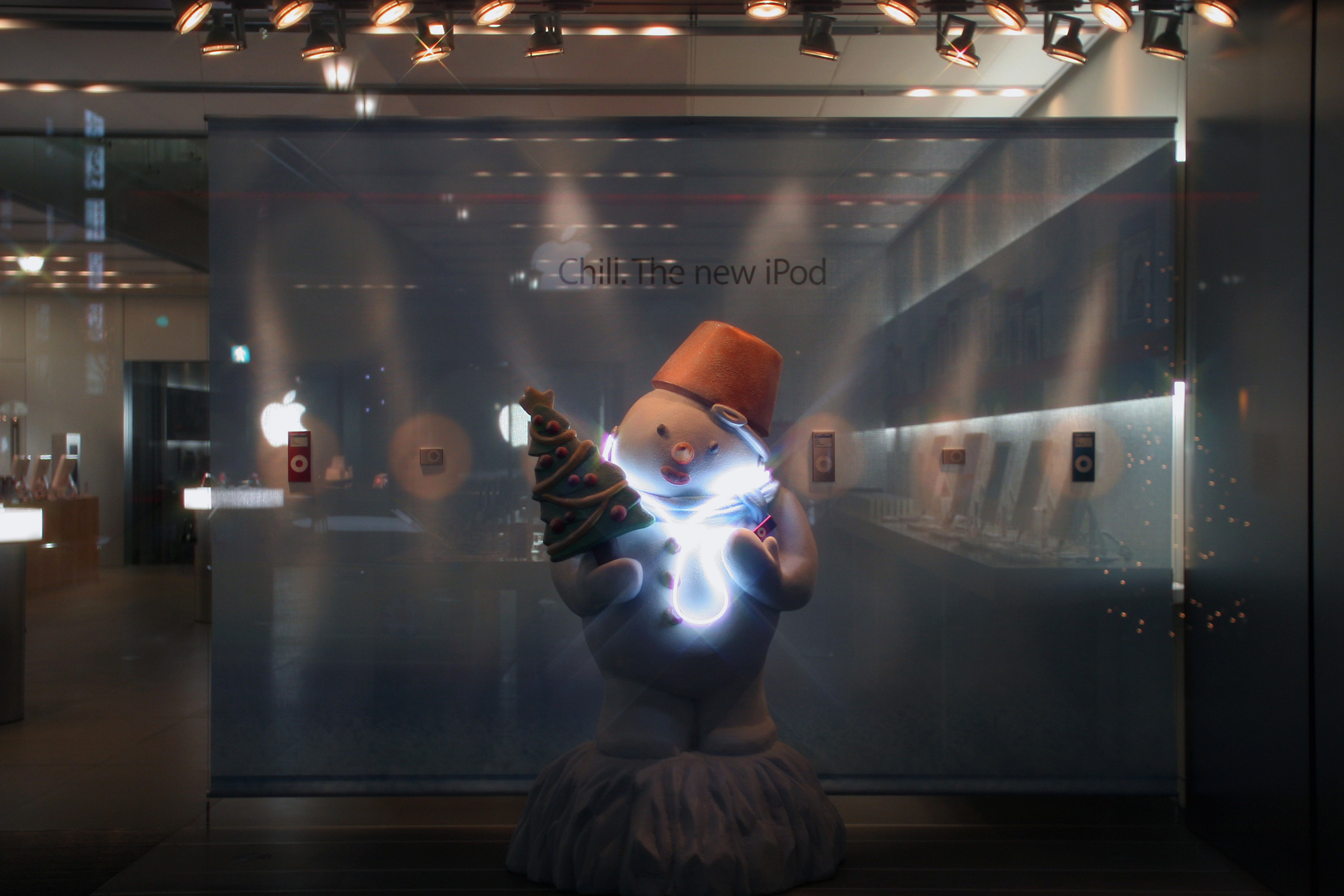 Six custom iPod snowmen were sculpted and painted for select stores around the world, including Apple’s former San Francisco flagship. The 5-foot statues were mirrored elsewhere with printed cutouts bearing a similar look. For MacBooks and iMacs, Apple created a lighted snow tunnel.