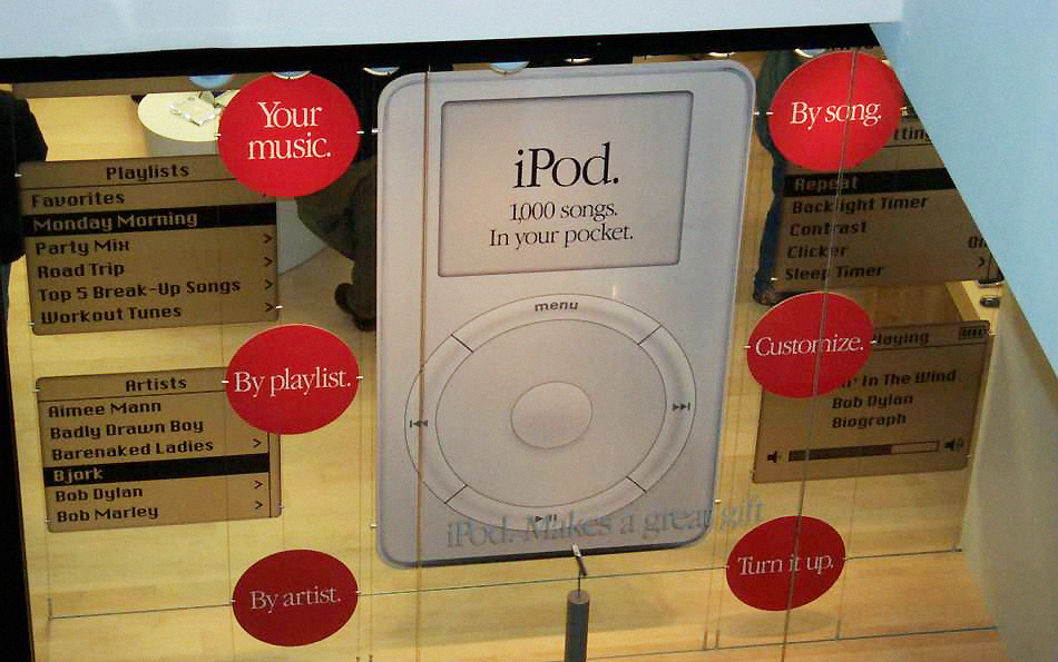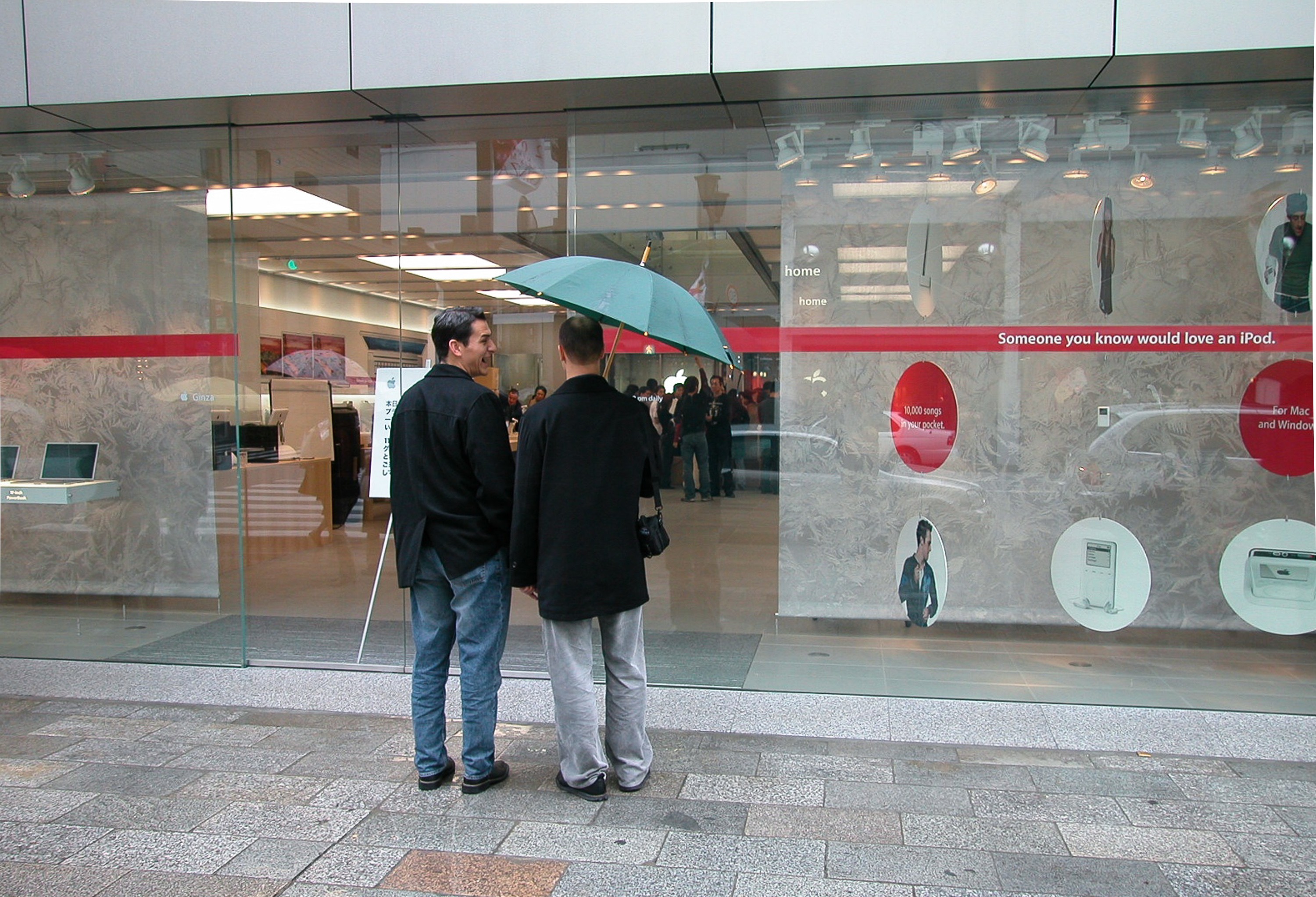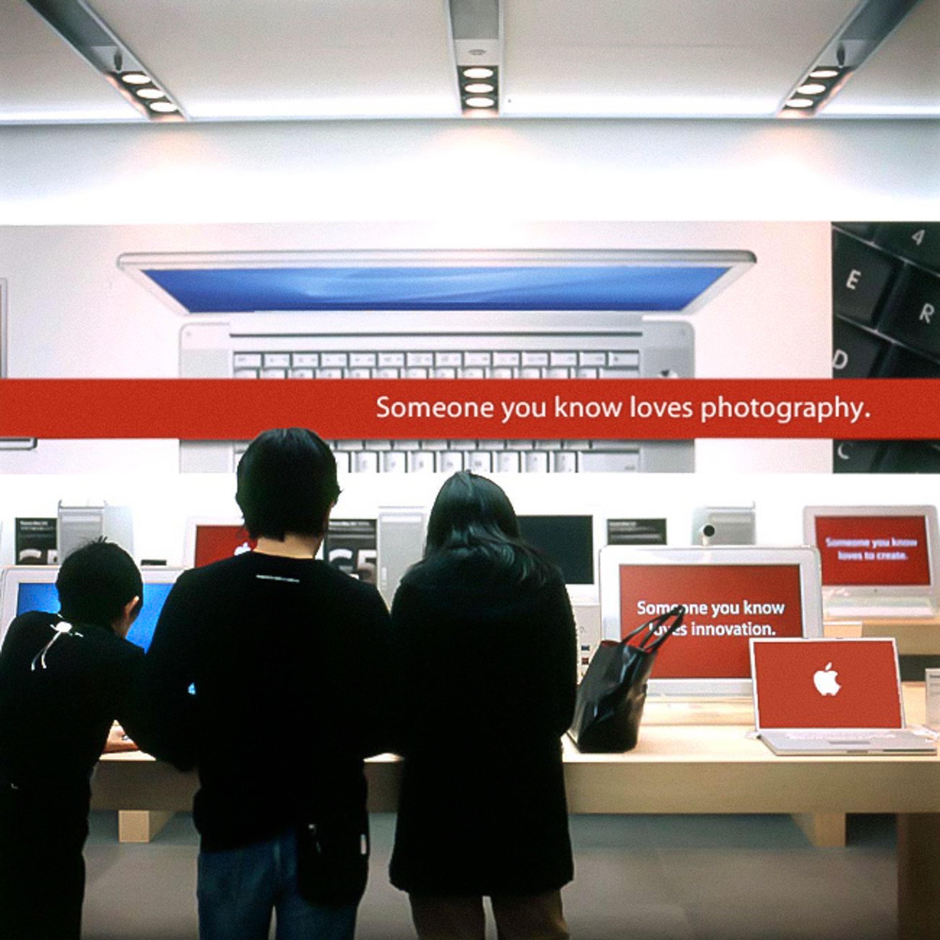 A bright red ribbon and frost fractals wrapped storefront windows in 2003. To promote the iPod and PowerBook line, Apple appealed to creative skills and focused on “someone you know.”