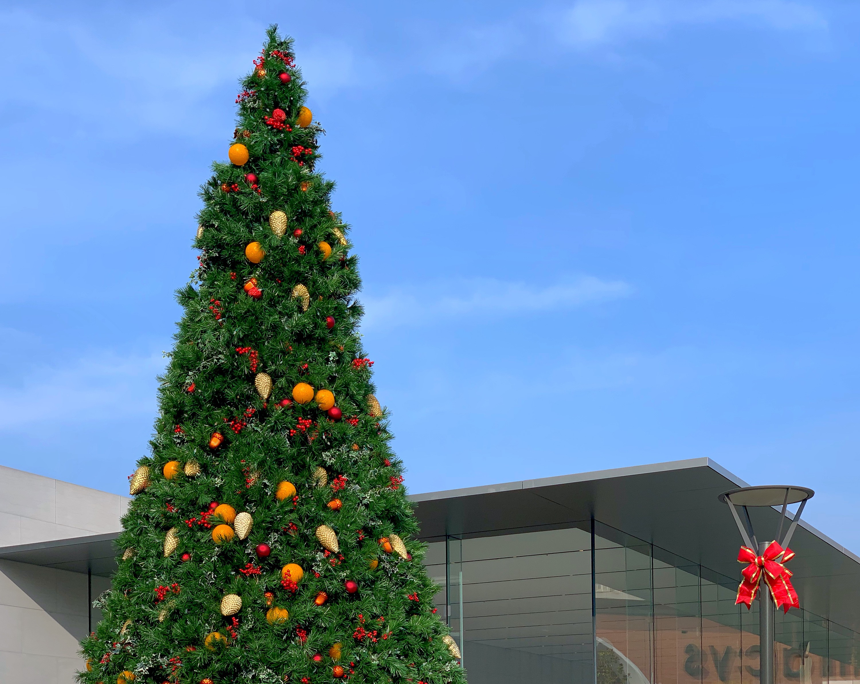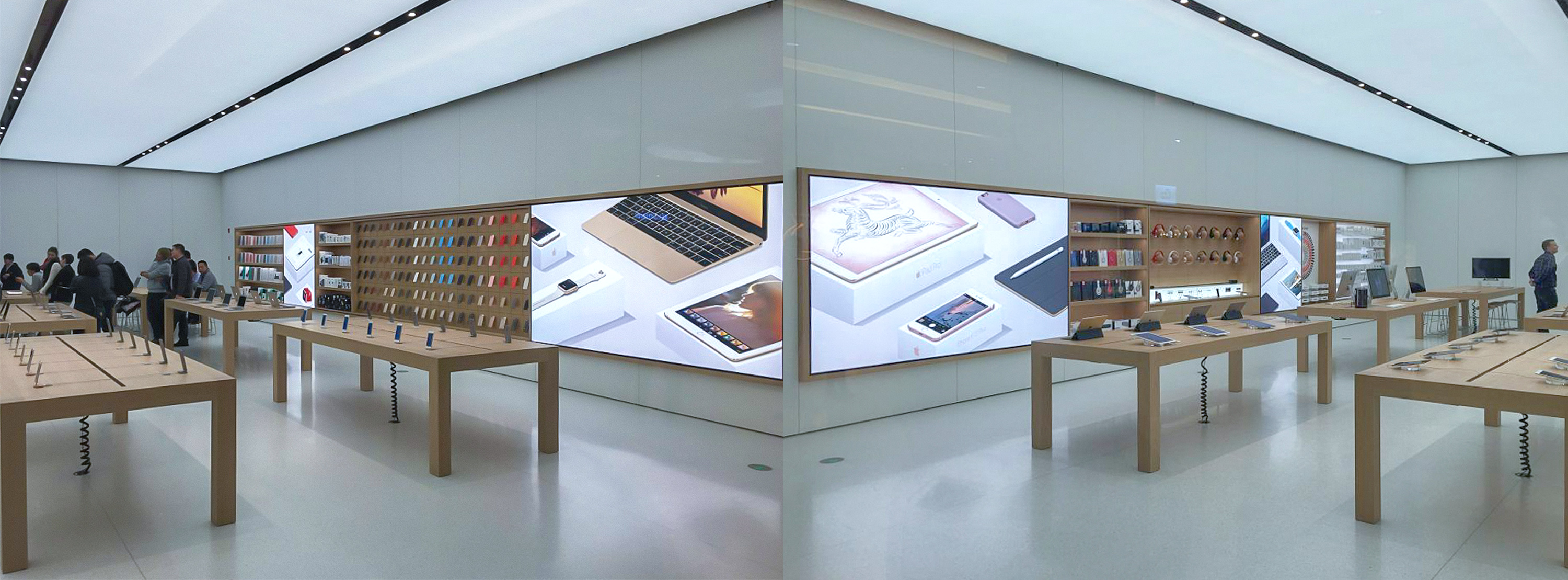 The latest era of Apple retail architecture beginning in 2015 brought with it an end to formal window displays during all seasons. Storefronts in new locations are entirely free of obstructions, and product showcases are reserved for each store’s wall-length Avenues. That doesn’t mean Apple has ended holiday decorations entirely, however. Each November, graphic panels themed in the style of Apple’s annual gift guide line the walls of stores around the world.
