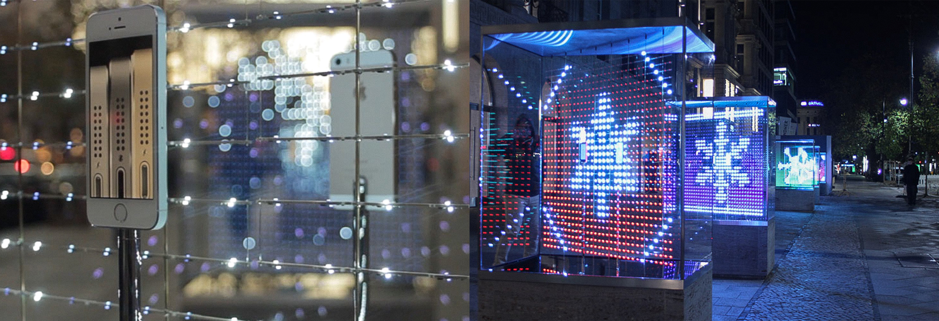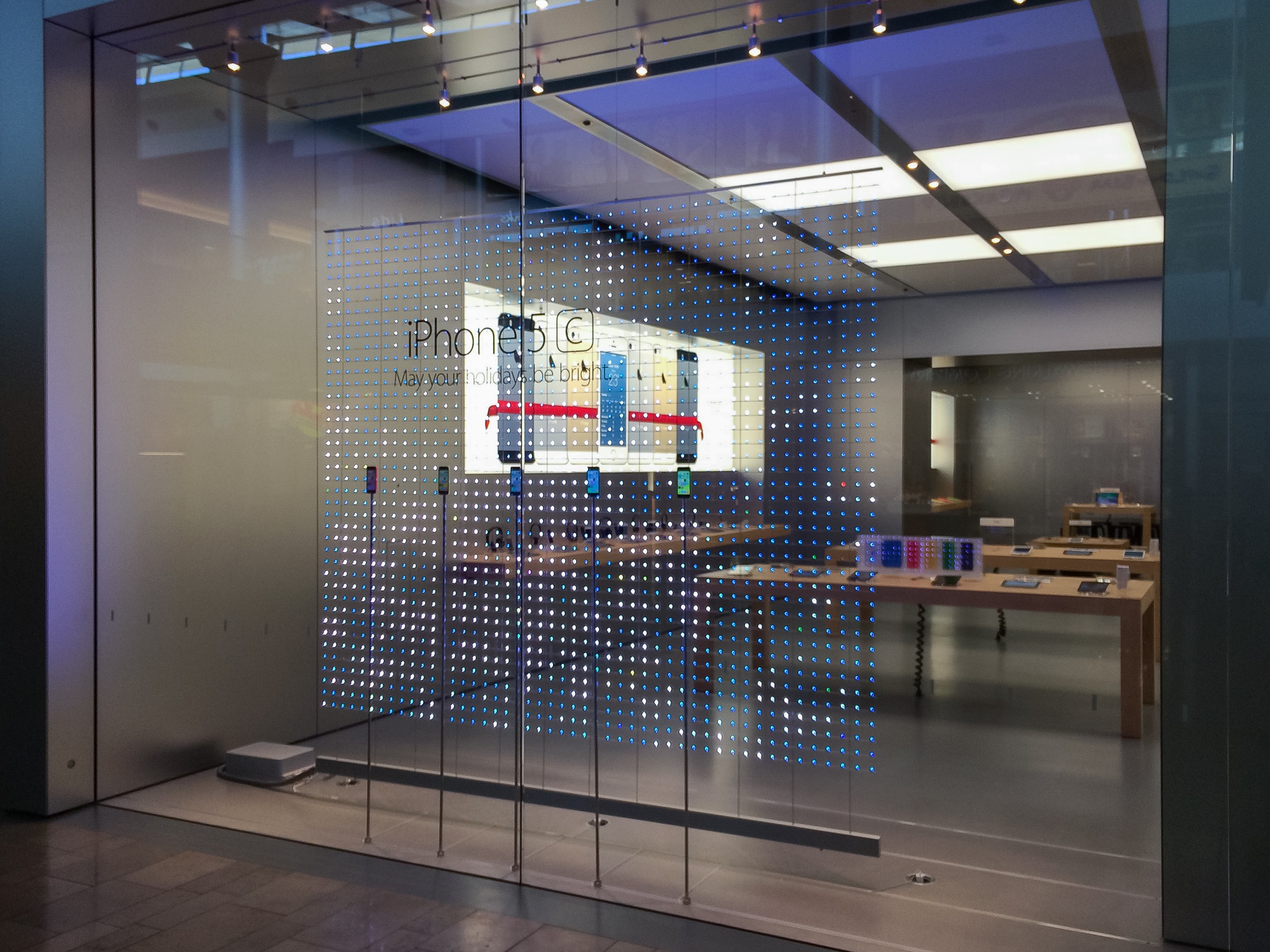 In 2013, Apple highlighted the iPhone 5c and iPad Air against curtains of multicolor LEDs. The light grids were designed to form animated patterns including falling snowflakes.