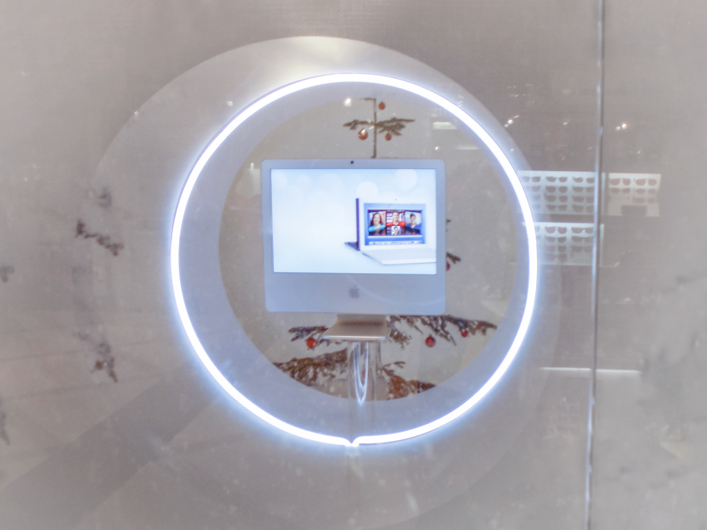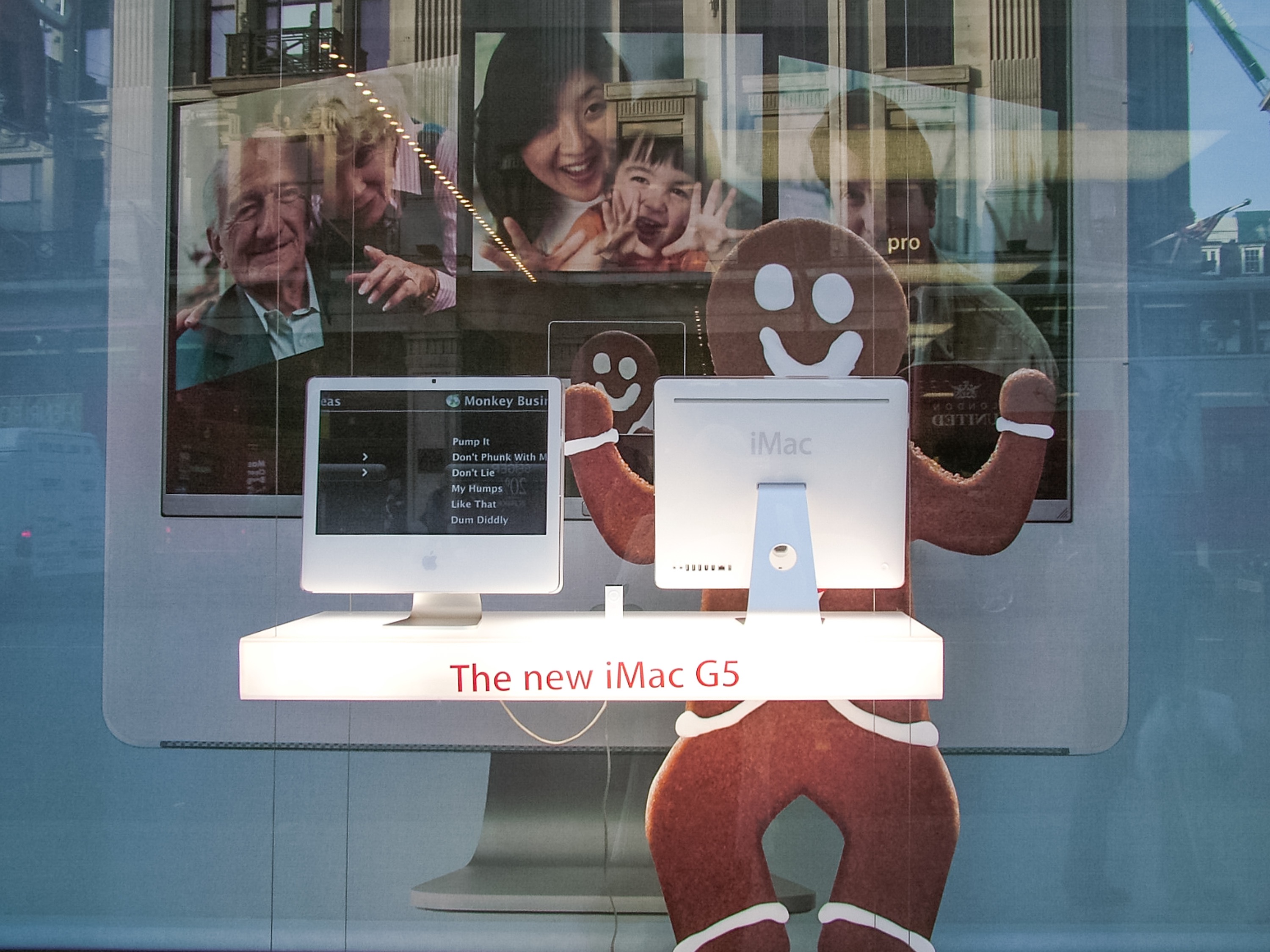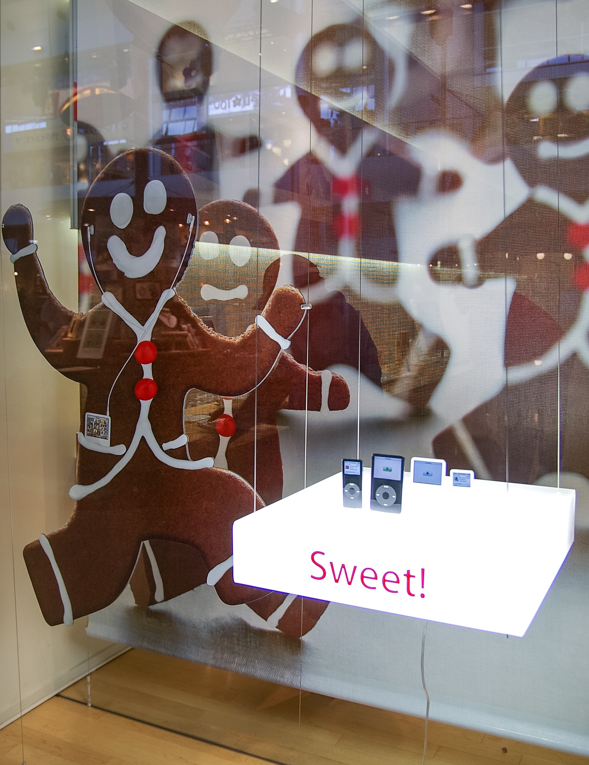 Like with FaceTime in later years, Apple promoted video chatting with friends and family for its 2005 display. Gingerbread cutouts sat behind iChat AV-equipped iMac G5s. The iPod line was also displayed on a glowing stand hanging from the store ceiling.