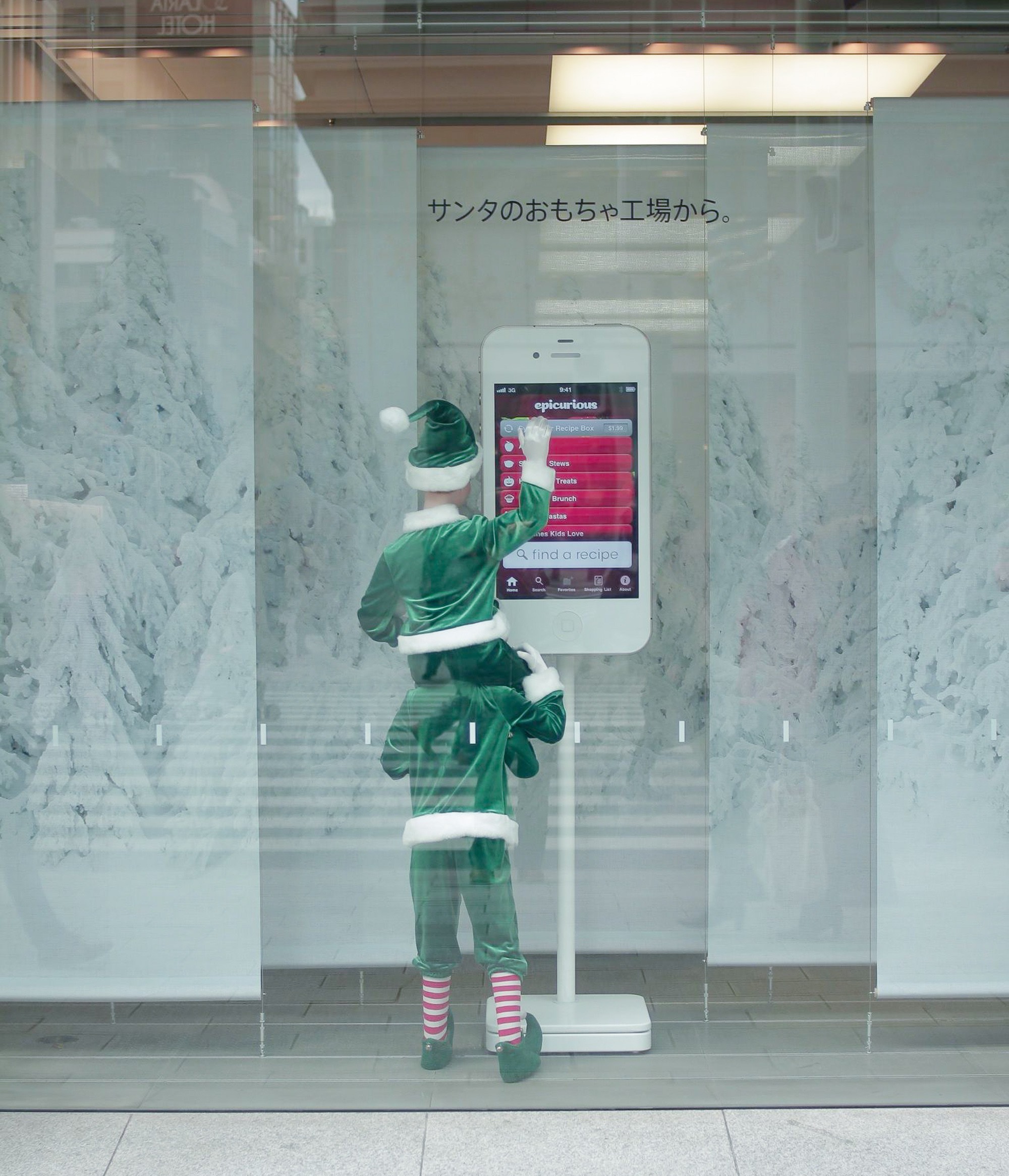 2011’s holiday scenes included oversized models of the iPhone 4s and iPad 2 with a focus on FaceTime. A cloud of suspended app icons dangled above the demo iPad, which cycled through App Store apps before receiving a FaceTime call front Santa Claus himself. In front of the iPhone, two elves worked together to say hi.