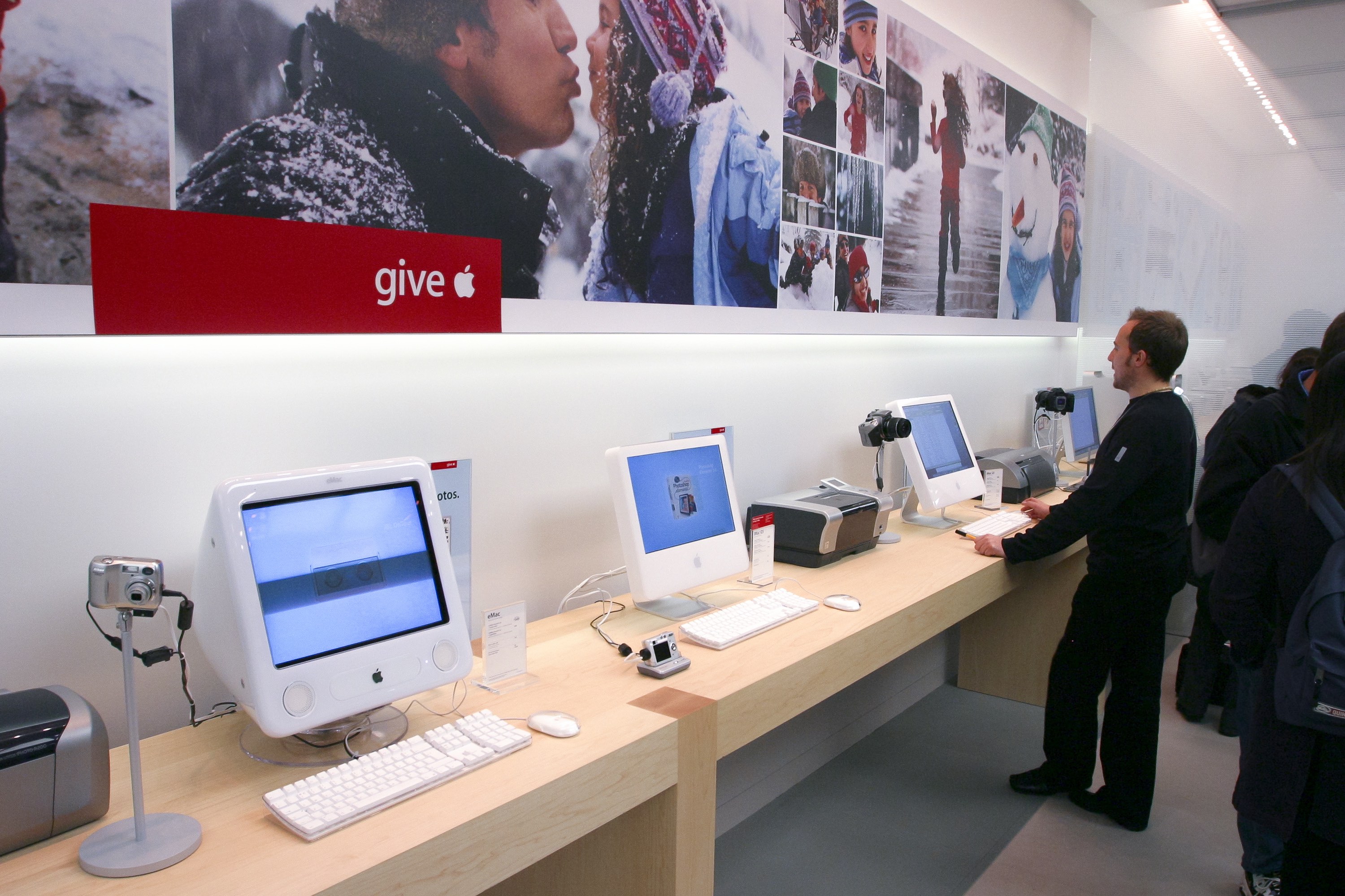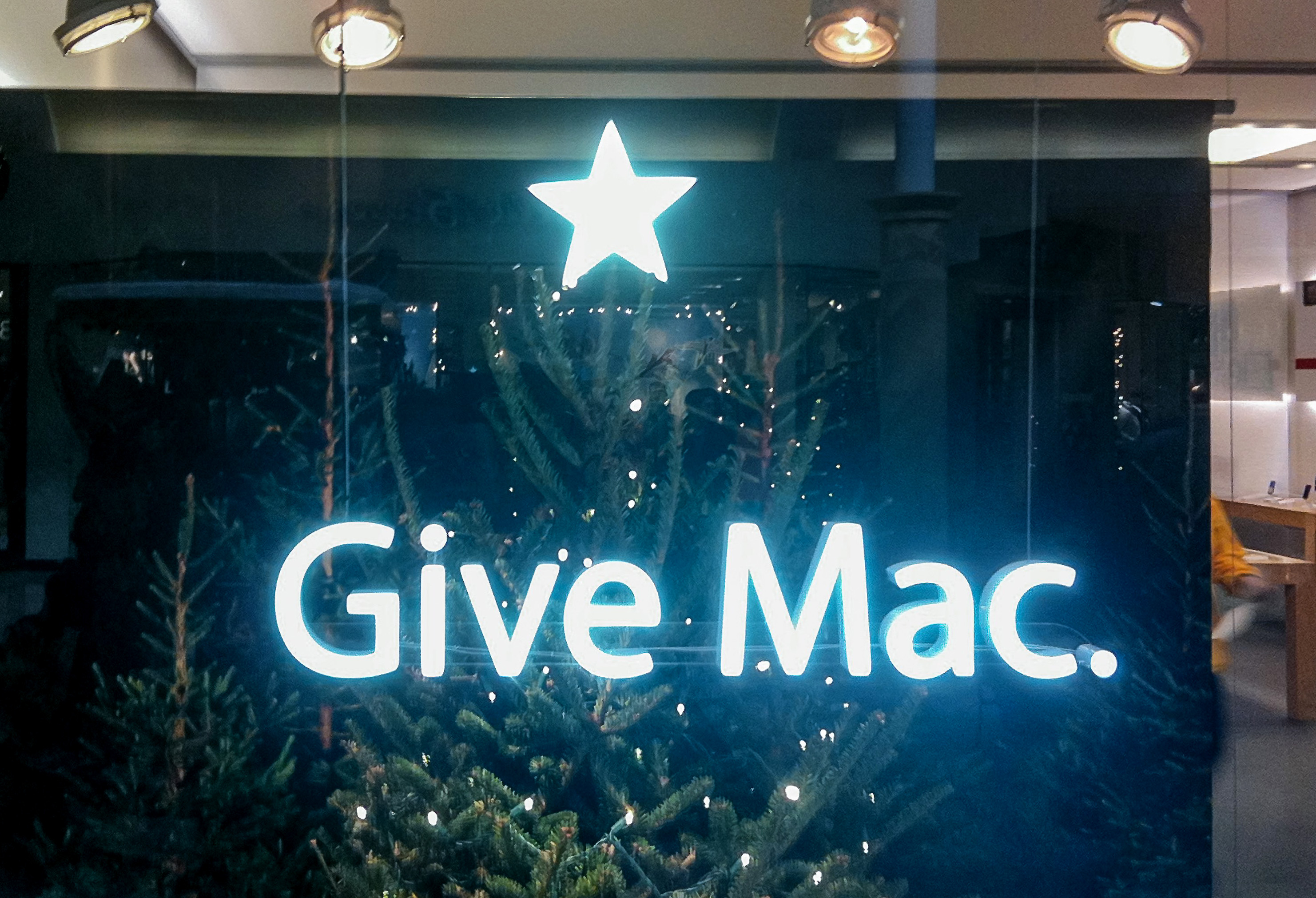 One of the most maintenance-intensive display projects Apple ever undertook was placing real Christmas trees planted in soil in storefront windows. Behind the slogan “Give Mac,” two MacBooks were propped on opposite sides of the tree. Machines were even installed to infuse the air with the scent of evergreens.