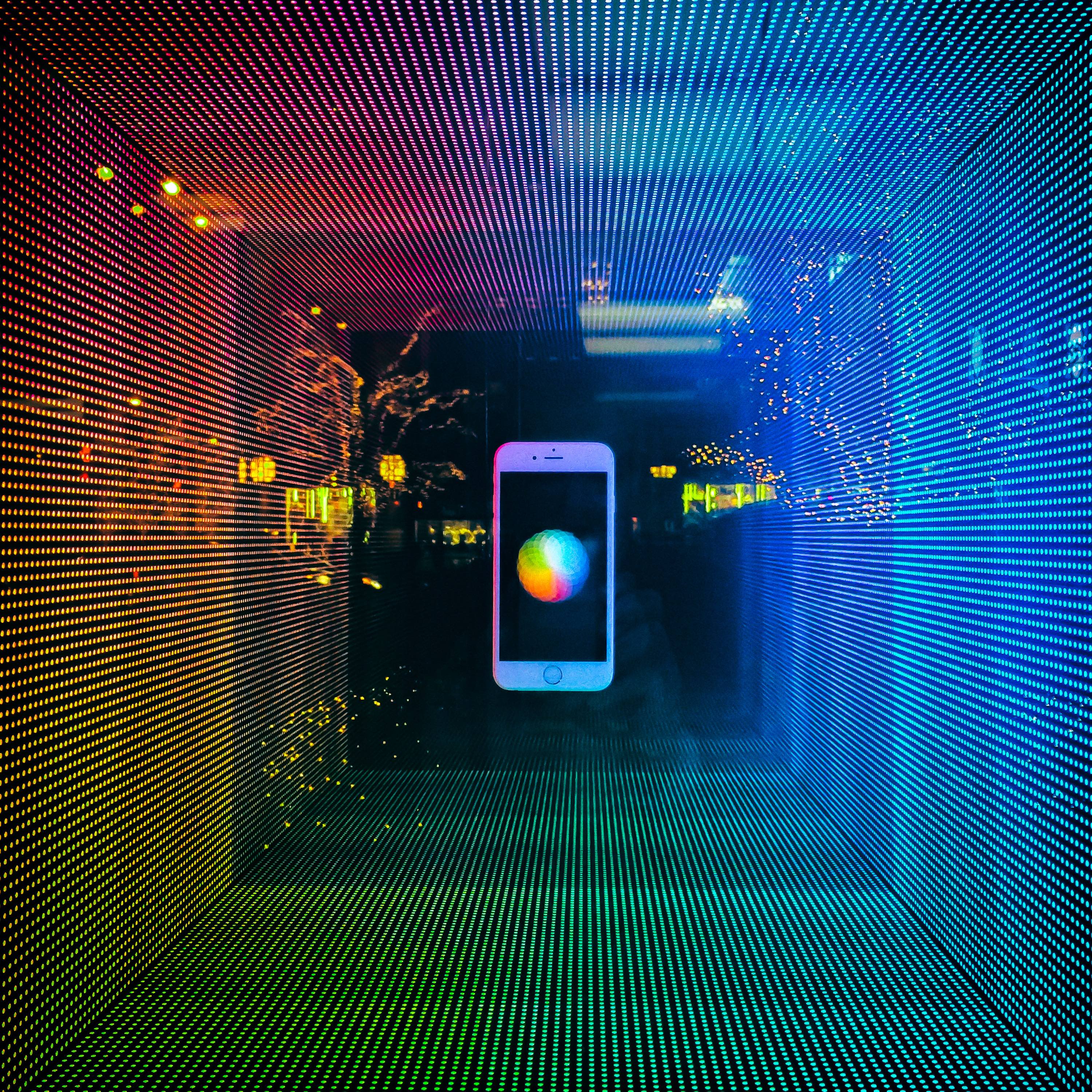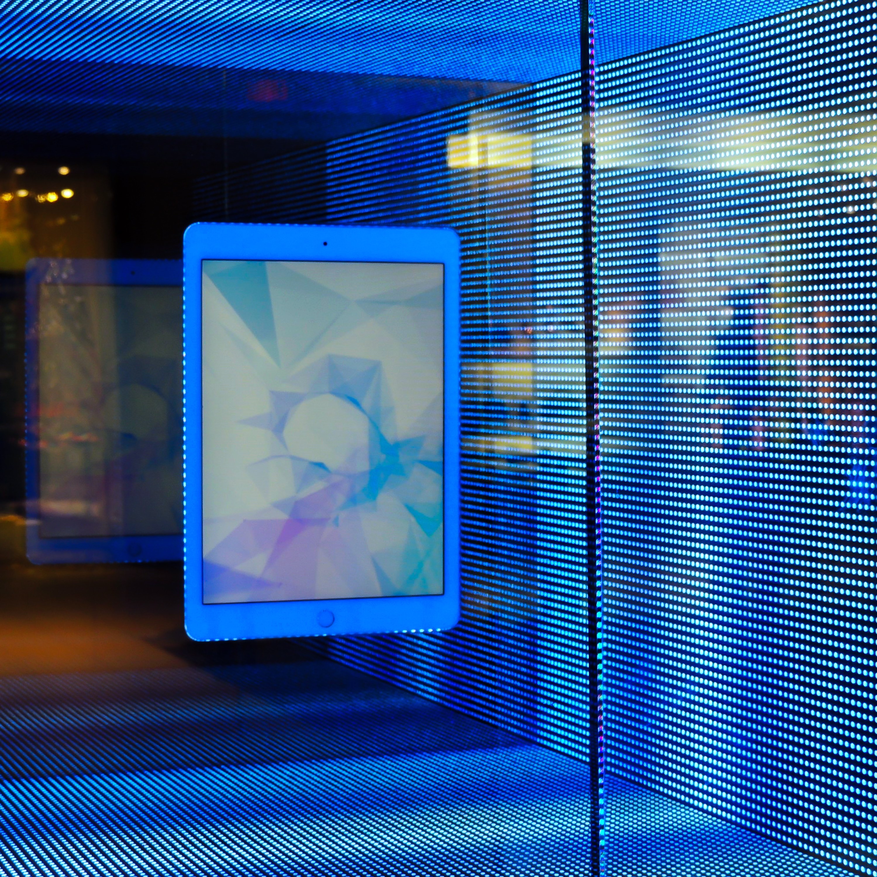 Two triple sets of infinity mirrors hung in store windows to promote the iPhone 6 and iPad Air 2. Each chromed box used a grid of LEDs to display mesmerizing patterns and animations. Demo devices suspended in each display ran loops of popular games and apps.
