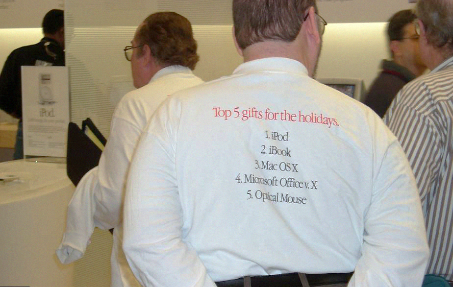 Apple was operating just about two dozen stores going into December 2001. With a brand new product called the iPod, the company had a perfect holiday gift. Apple’s first window displays were more general-purpose than in later years, but set aesthetic standards for years to come. Lighted pedestals and oversized models of products were eye-catching even from a distance. Inside, special t-shirts and signage listed the “Top 5 gifts for the holidays.”