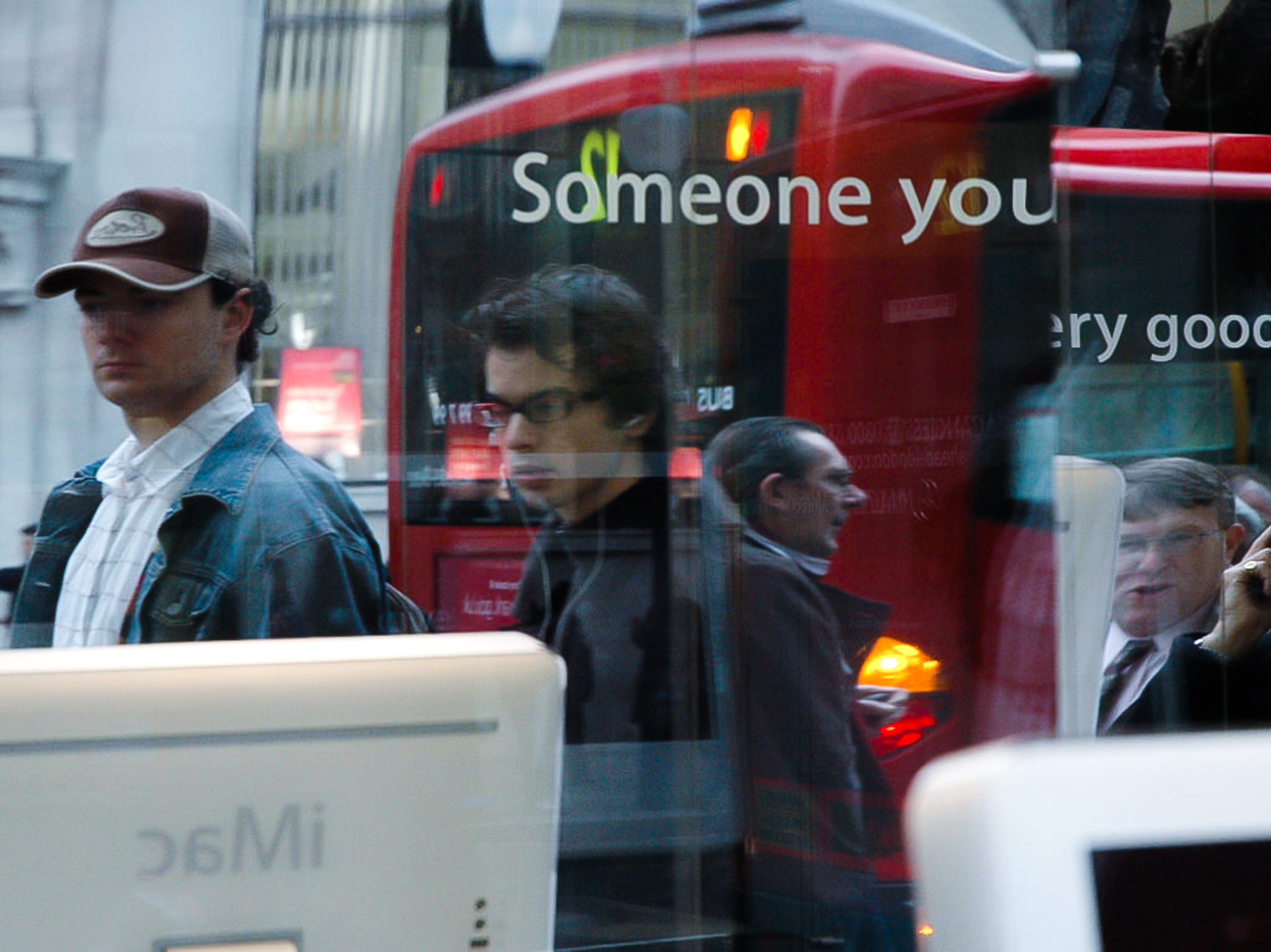 The grand opening of London’s Apple Regent Street lined up almost perfectly with new holiday window scenes around the world. The brand new flagship store displayed hanging posters and acrylic stands staggered in a collage to showcase the iPod and iMac G5 lines. The photo collage theme extended inside stores to “give ” graphic panels and printed marketing materials.