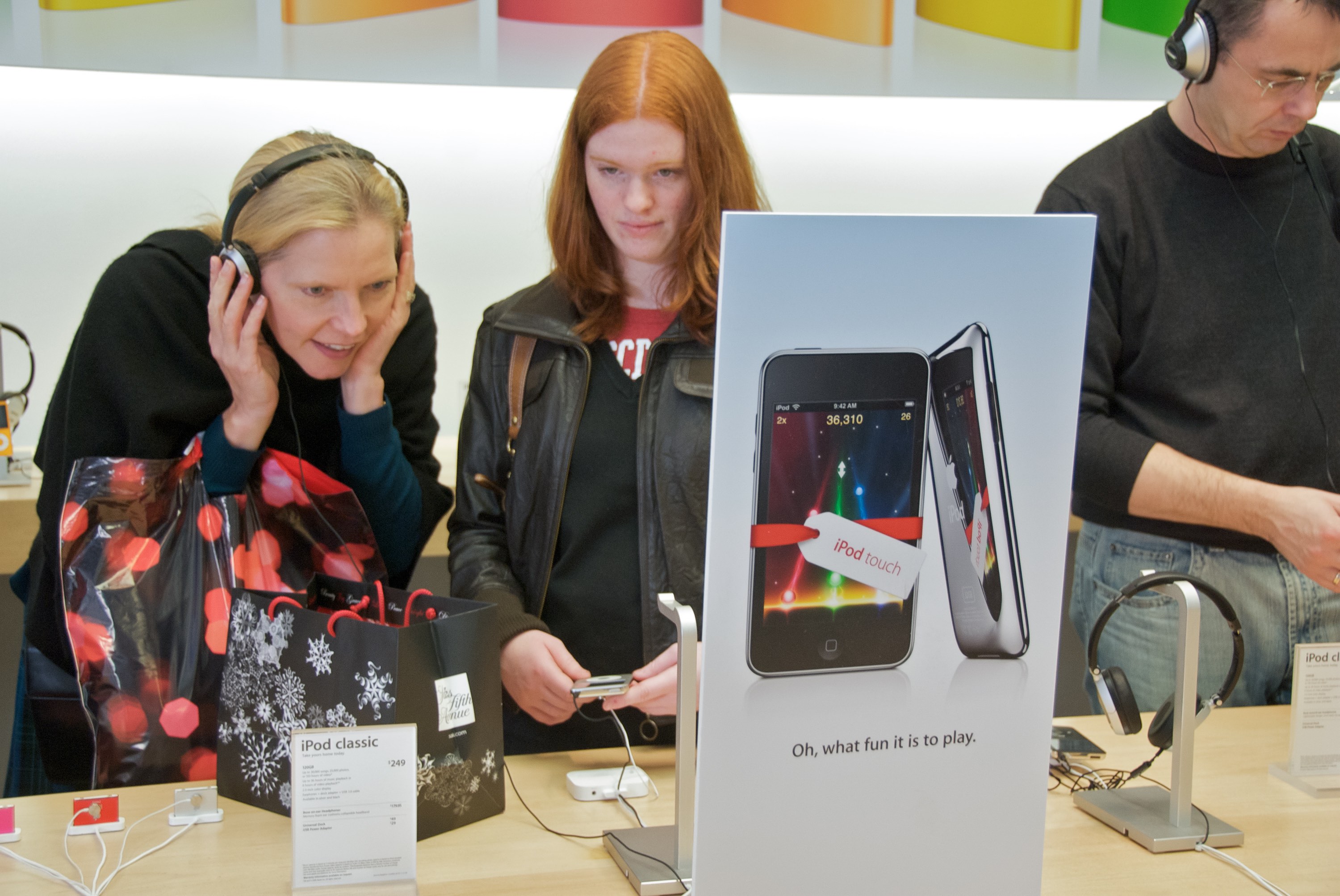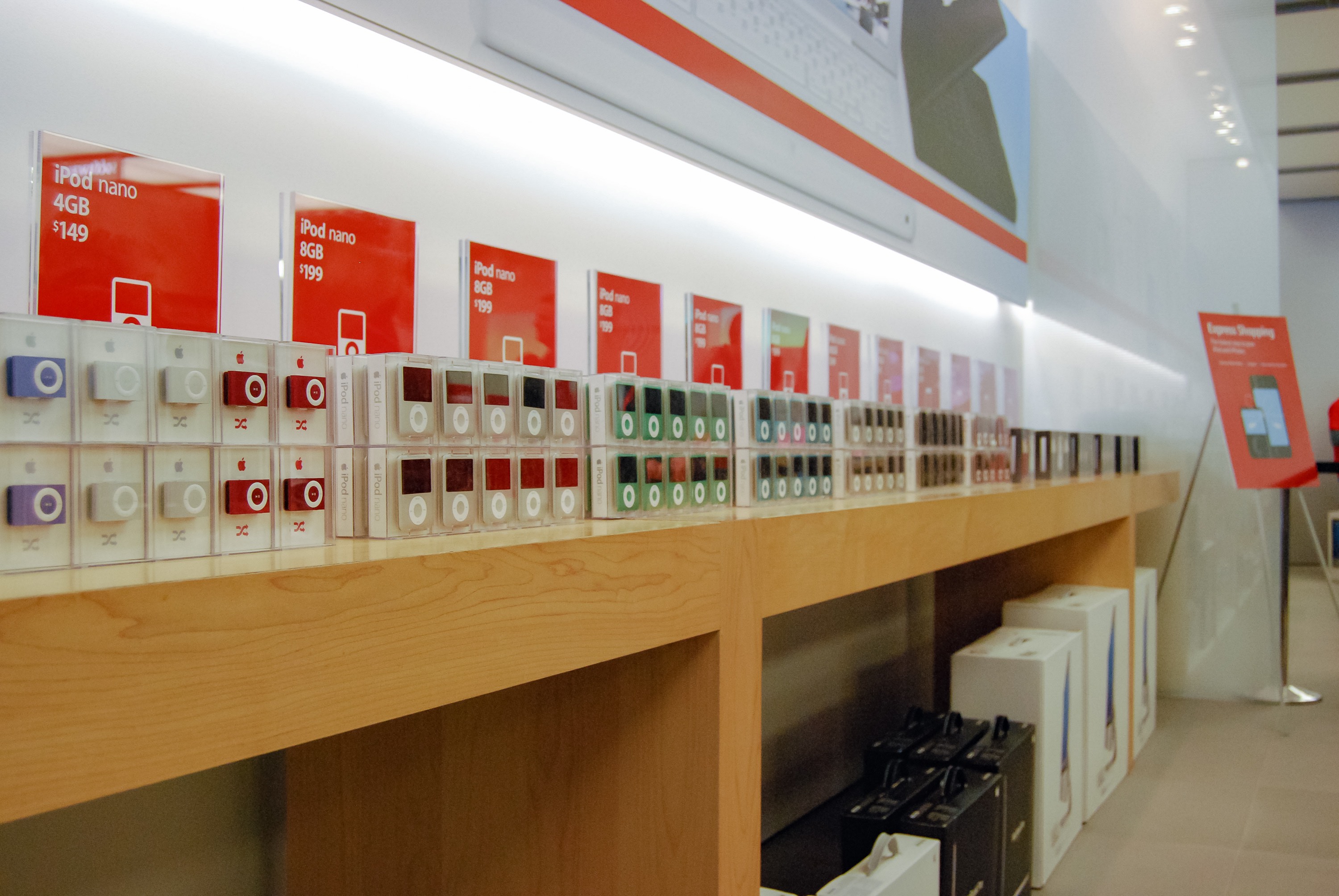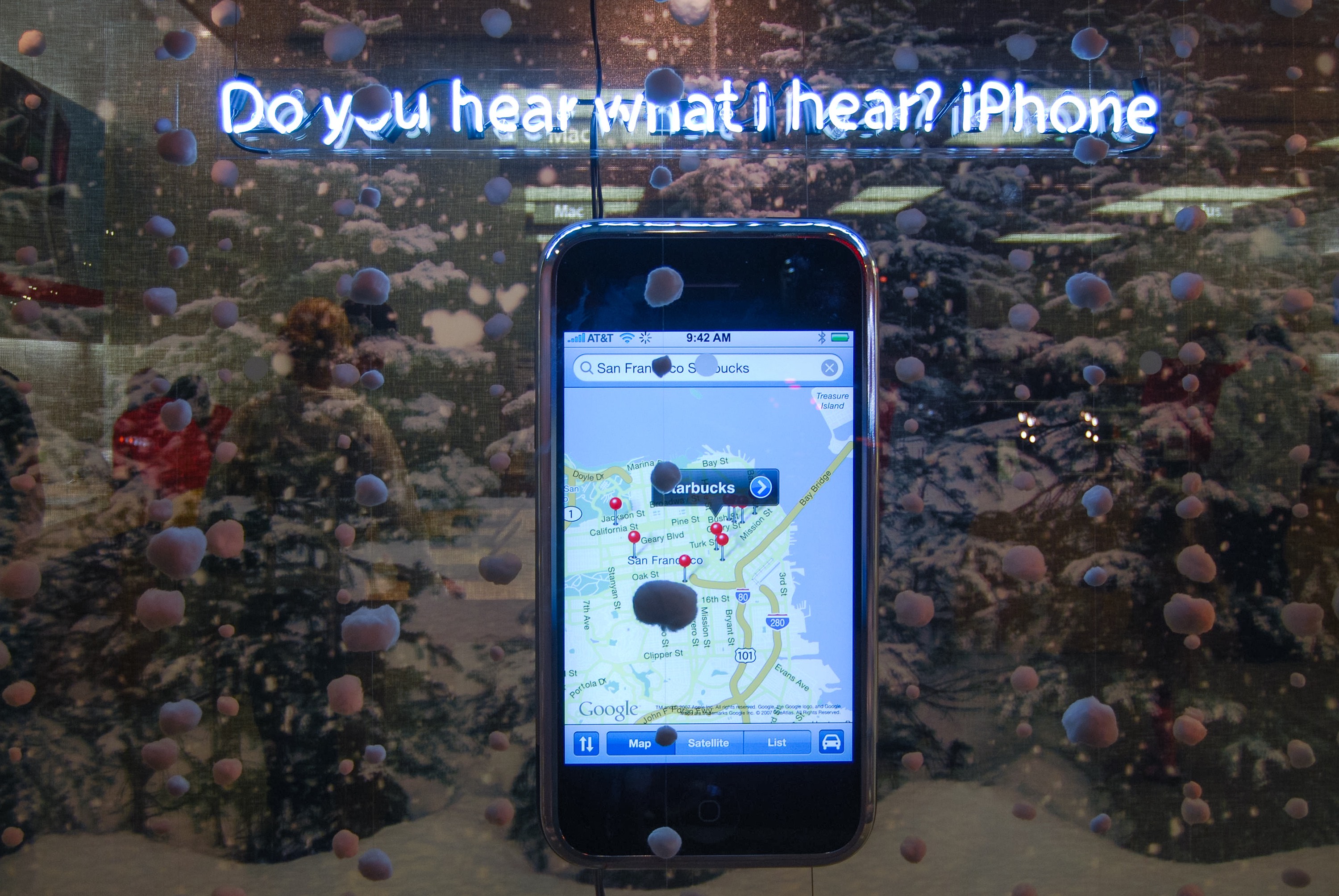 For the iPhone, Apple suspended neon fixtures reading “Do you hear what I hear? iPhone” over giant models of the device. In some locations the display was tweaked slightly and used an iPod touch with appropriate signage. These promotional models used television-sized LCD displays connected to a Mac behind the scenes to run a demo video loop.