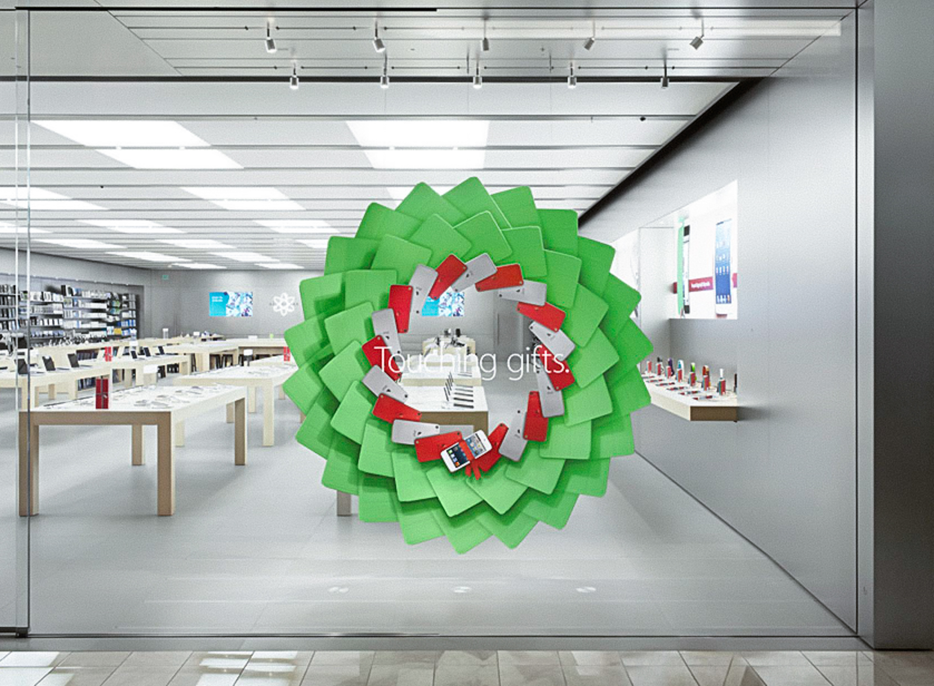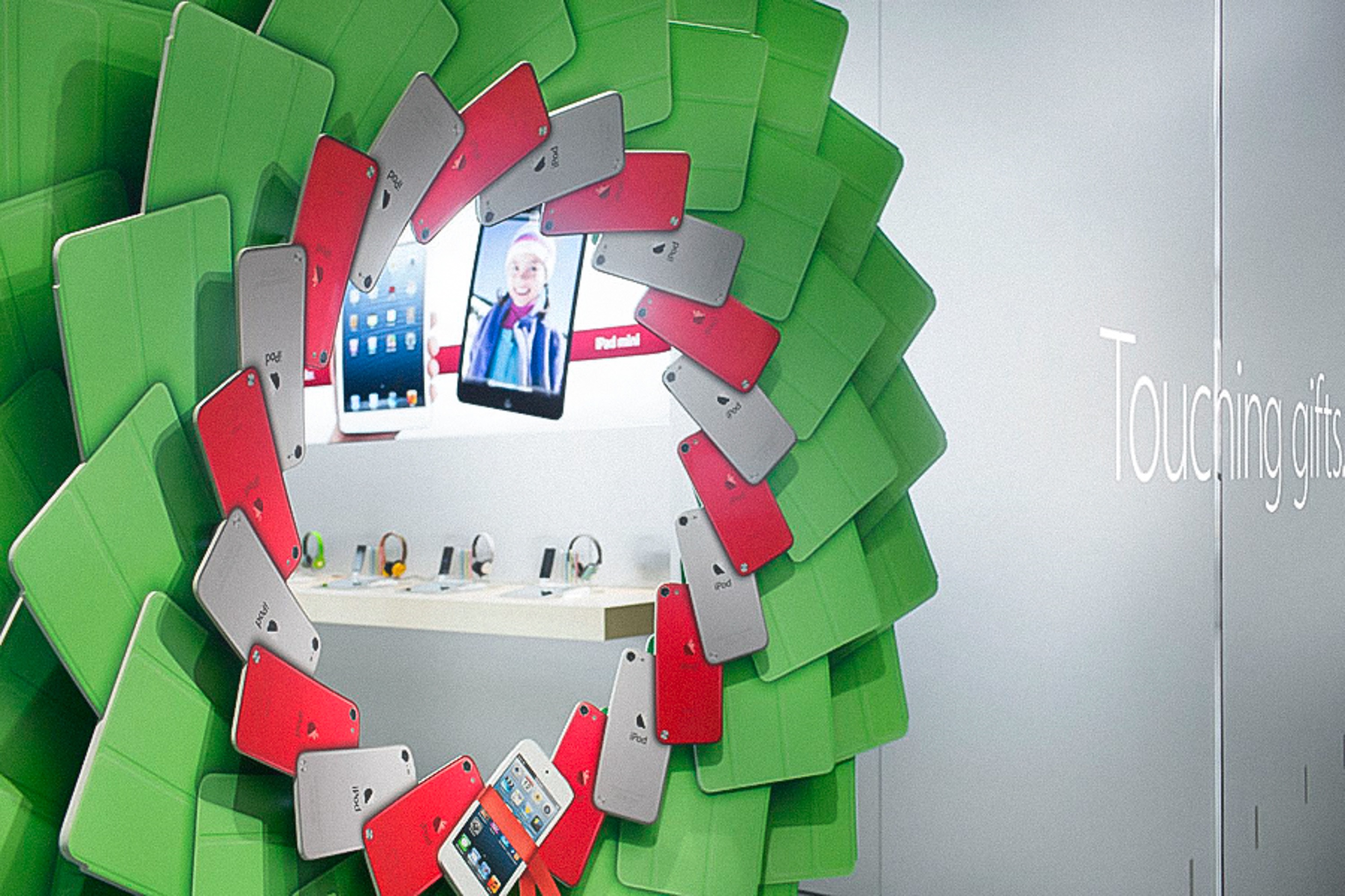 Featuring iPad Smart Covers and alternating colors of the iPod touch, Apple’s 2012 holiday wreath encircled the wordplay “Touching gifts.” 220 stores worldwide featured the wreath, which was made from printed and layered sheets of PVC foam board. The design is reminiscent of the iPad mini Smart Cover ad that preceded it.