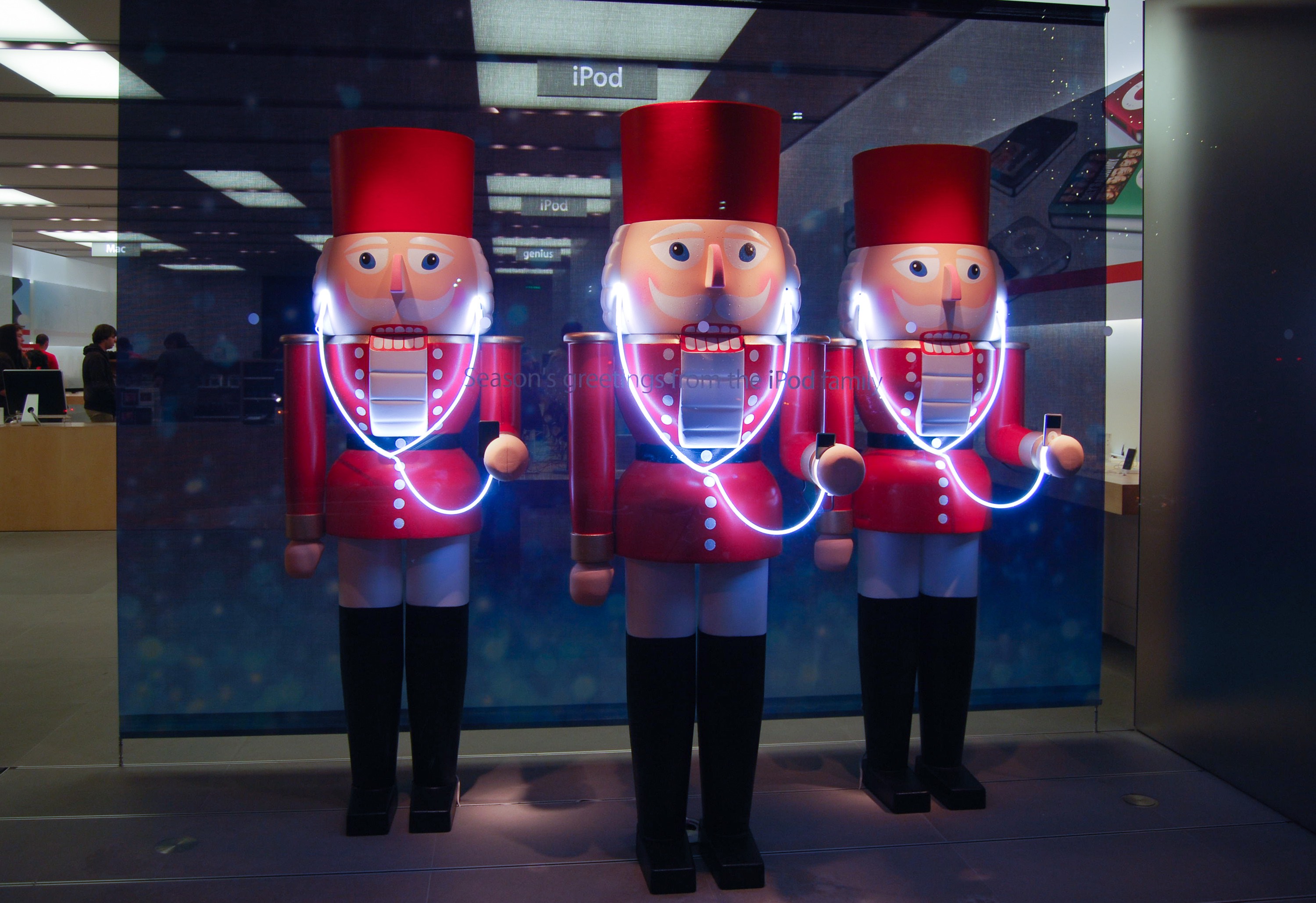 Both the iPhone and iPod touch were totally new in 2007, giving Apple an extra special opportunity to showcase cutting edge technology. The iPod line was promoted with a set of three nutcrackers holding the iPod touch, nano, and classic. Text on the window read “Season’s greetings from the iPod family.”