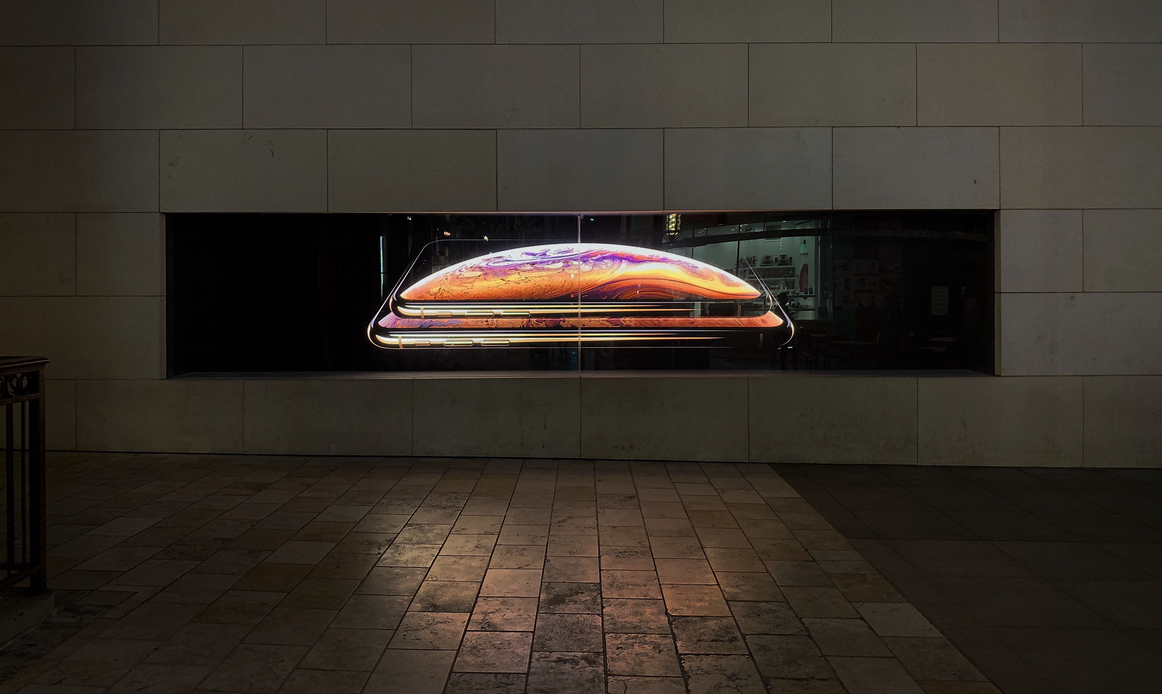 New graphic panels, and in classic stores, 3D feature bays highlighted Apple’s ecosystem of services and apps. These displays were later updated with reflective iconography for the holiday season. Apple had previously rolled out a new backlit Activity Avenue at modern stores starting in June with Apple Beverly Center. In London, at least two major department stores featured stunning and dynamic displays depicting the iPhone XS live wallpaper and watchOS 5 motion watch faces at dramatic scale.