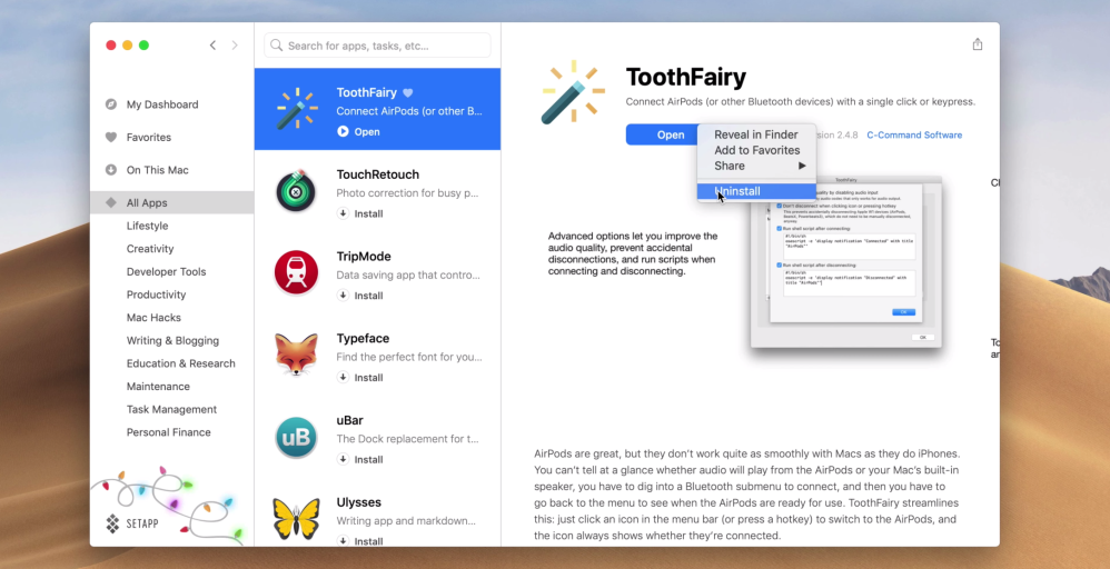 For the monthly subscription cost, it offers an App Store-like experience allowing users to browse, discover, install, and open apps in just a click. The apps are the same full versions of apps you would find outside of Setapp, which makes the monthly price quite attractive when adding up the standalone cost or subscription costs of all the included apps. The model not only provides apps you need frequently at a great price, but also gives you the whole collection of 100+ apps that you might not normally invest in but can now use from time to time when needed.