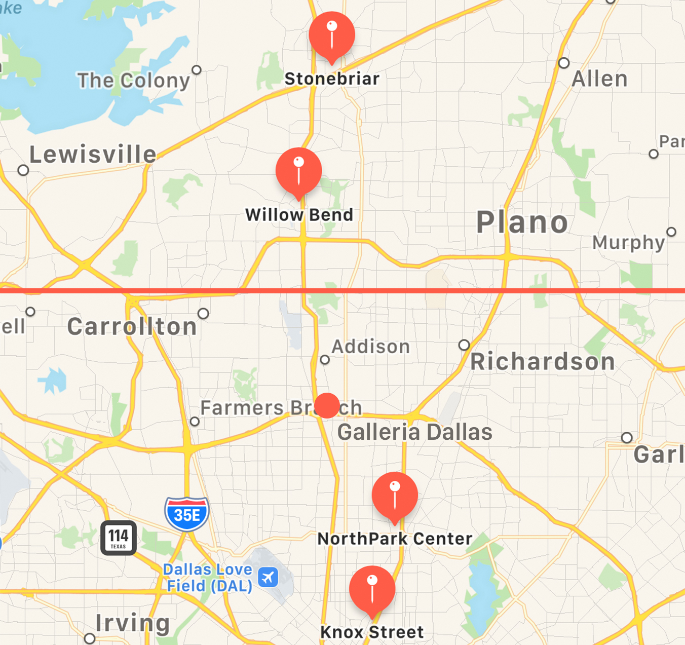 Galleria Dallas in relation to Apple’s existing stores and the Eastern District line.