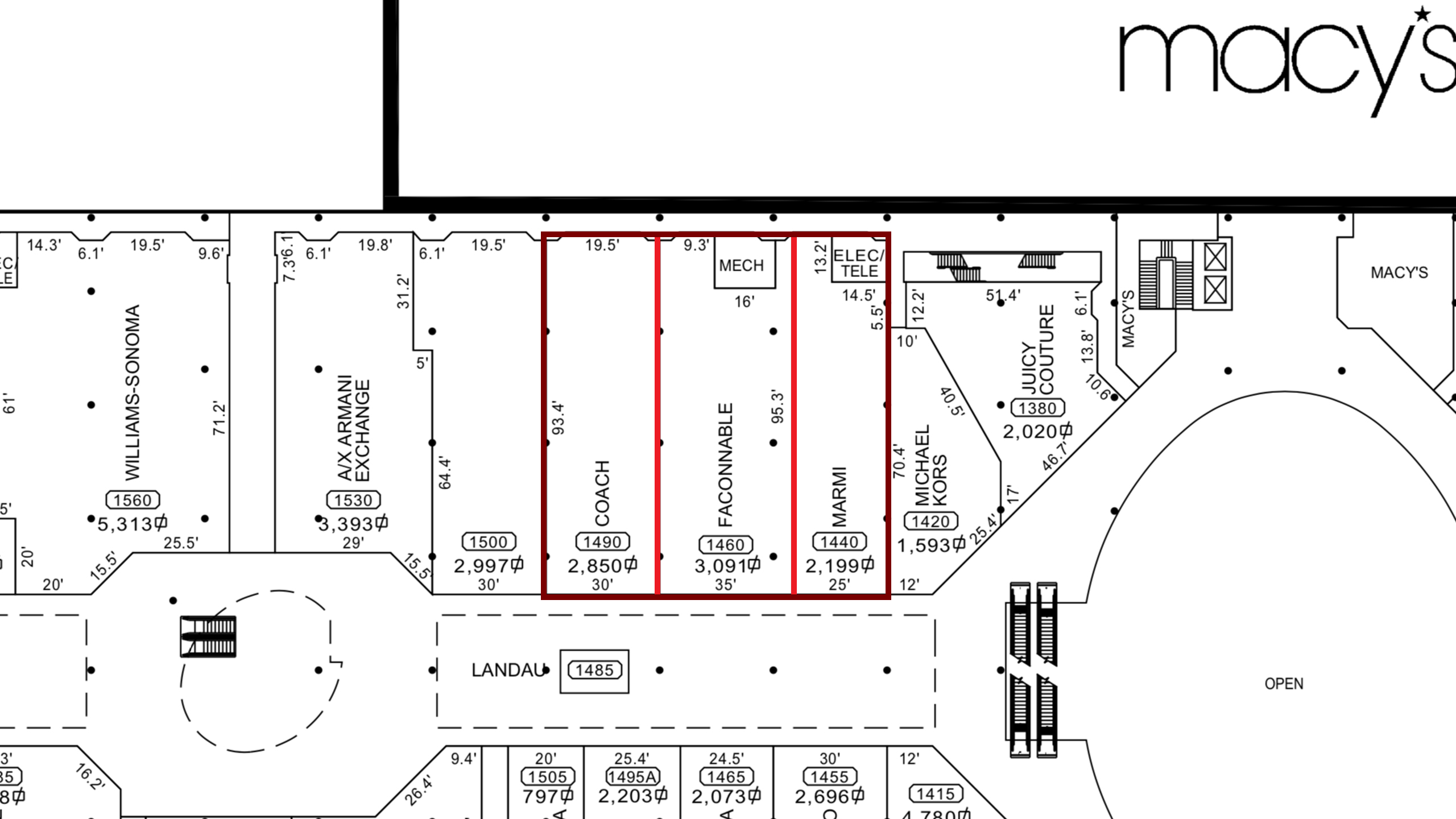 Permits show that Apple is renovating suite 1460 for its store. A 2013 mall floor plan reveals that the space is significantly smaller than the 8,155 sq. ft. area applied for. It’s likely that spaces 1490 and 1440 have been merged to create one wider storefront.