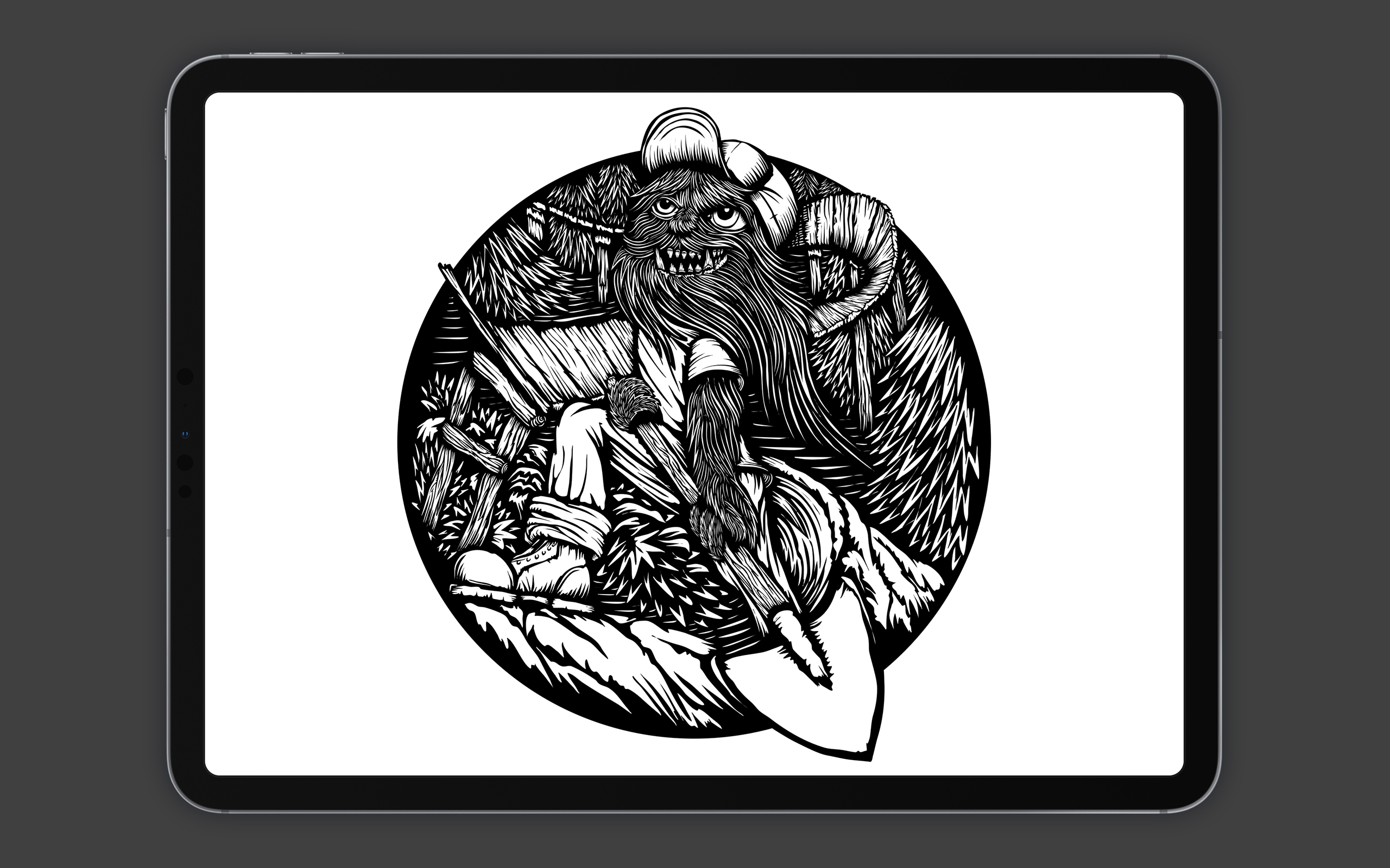 From Procreate, Neil moves his concepts to Affinity Designer on the iPad to begin the final illustration. He uses his favorite tools carried over from Adobe Illustrator — the pen, pencil, and pathfinder operations — to complete the majority of the vector work. Intricate shapes and negative space reference the century-old technique of linocut printmaking.