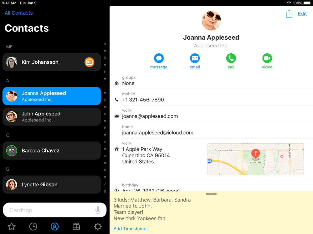 - Notes you can use! Apple’s built-in Contacts app features a section for adding notes to contact cards, but it’s so buried and inaccessible that you may not even know that — much less rely on it for recalling important details when you need it. Cardhop promotes the notes section to a real feature that you can easily access when viewing any contact card. The notes panel is persistent, resizable, and lets you easily append timestamps to new entries.