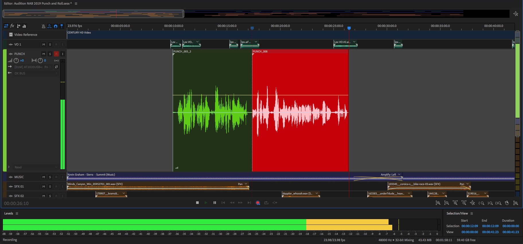 New Punch and Roll recording in Audition provides efficient production workflows in both Waveform and Multitrack for long-form voiceovers and narration. Use it to accurately punch in replacement audio and continue recording a performance without interrupting your flow.