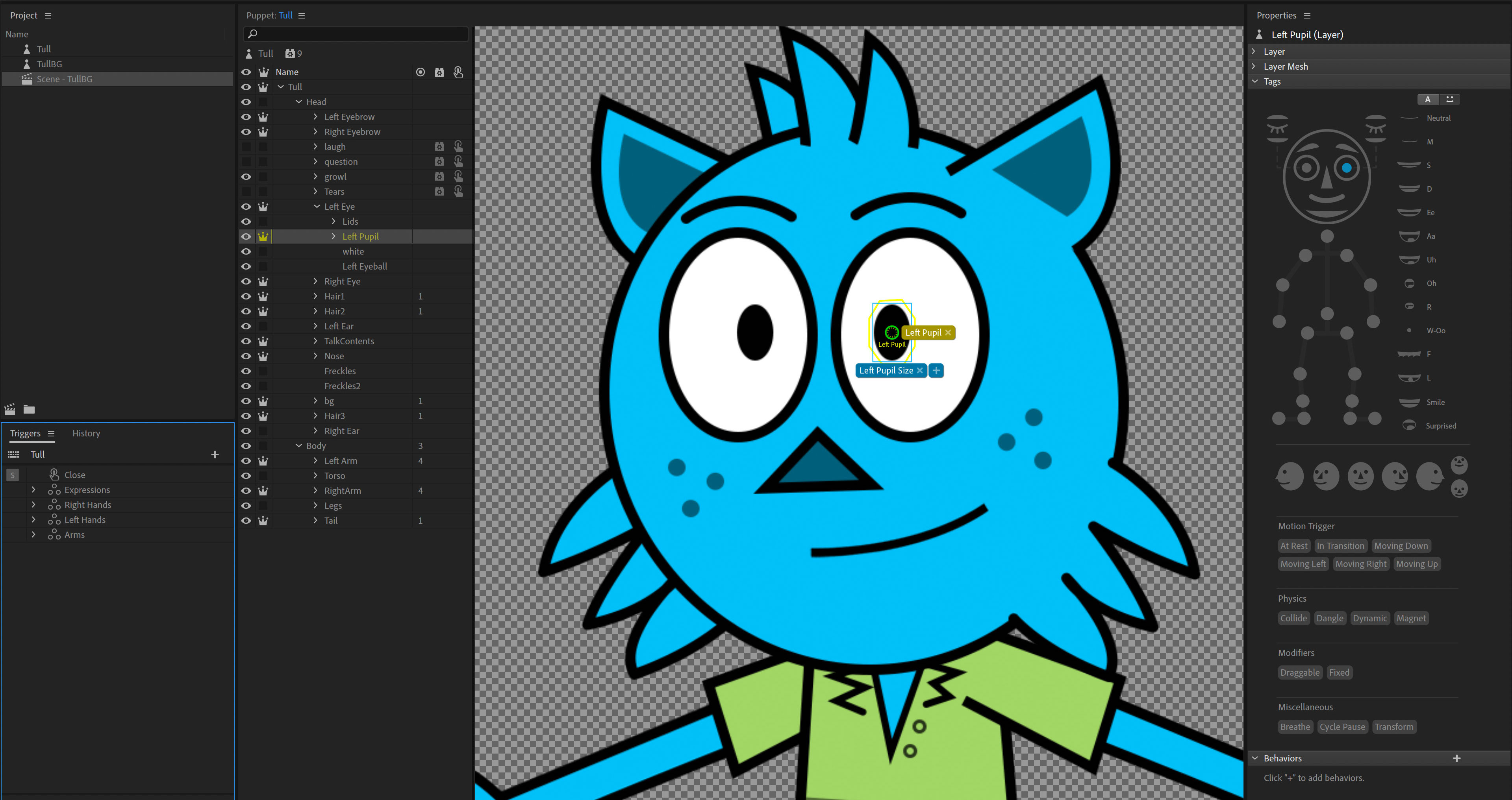 With better Puppet rigging you can apply behaviors, tag layers, and search through puppet rigs, allowing you to accomplish more within your established workflows. Apply attributes to single layers or any group of layers, simplifying the setup for complex puppets that allow for more nuanced performances.