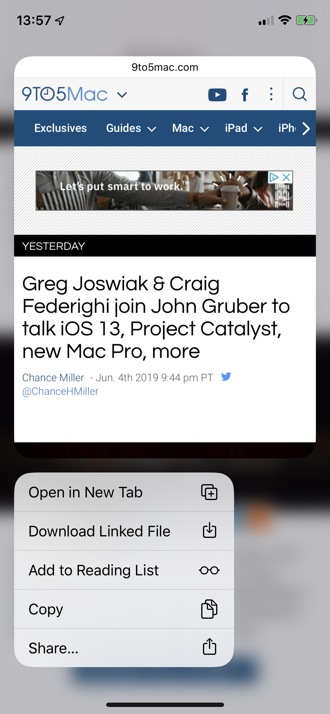 You can access a new previewing interface with a long-press, the replacement for the 3D Touch Peek. For example, long-pressing a link in Safari now displays a small window preview of the link’s destination with various actions below. If you are on iPad, long-press also activates Drag and Drop interactions. If the Peek is visible, you can just keep dragging to cancel the preview and continue with drag-and-drop.