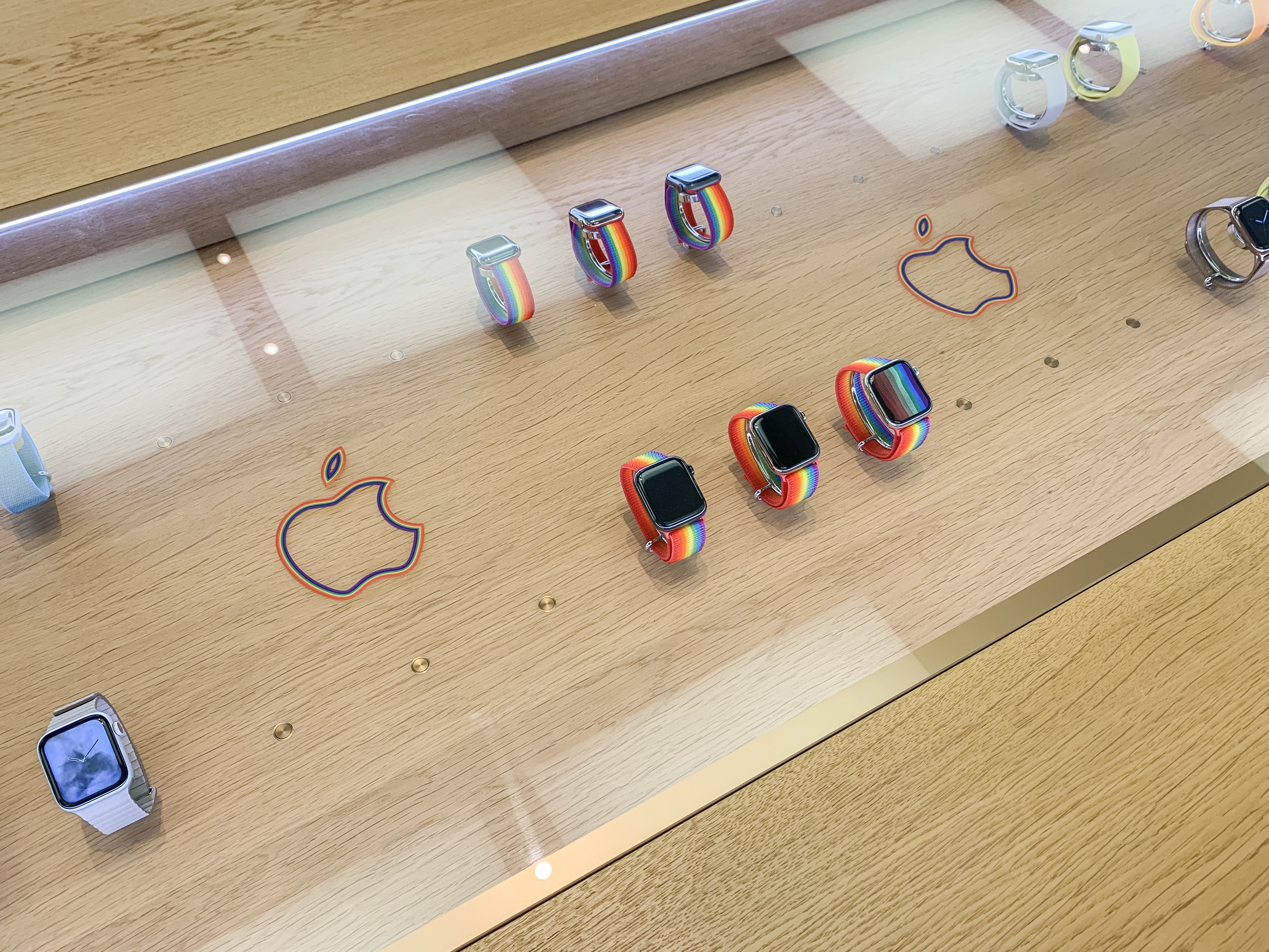 June is Pride Month, and since 2016 Apple has shown its support in the form of special edition Apple Watch bands and later watch faces with a rainbow theme. In previous years, Apple Watch display tables in a handful of select retail stores were redecorated with a white backdrop, rainbow Apple logo, and Pride bands. This year, Apple is rolling out Pride displays to stores across the world with a new design and 2019’s Sport Loop front and center.