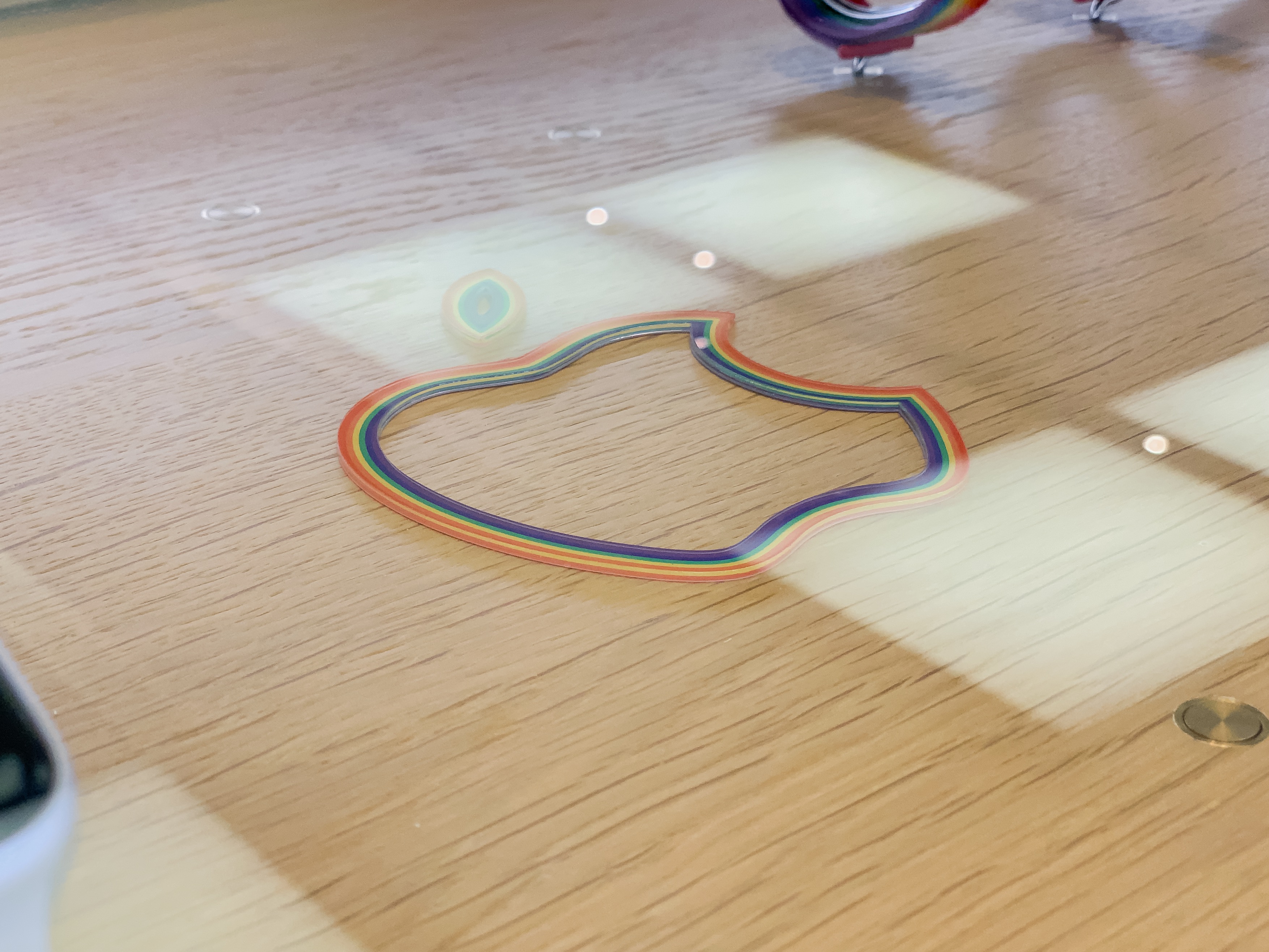 Now that the band is available for in-store pickup, Apple has updated the center of Apple Watch display tables to feature six watch models with the Pride band. A precision-cut dimensional Apple logo has been placed on both sides of the display featuring the same “thread” arrangement and colors as the band.