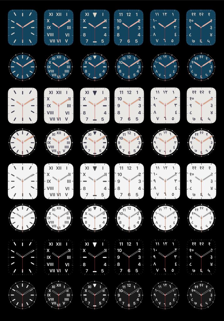 The default style of Apple’s California face borrows from those traditional characteristics: dashes for three, six, and nine; an inverted triangle for twelve; Roman numbers for one, two, ten, and eleven; and Arabic numerals for four, five, seven, and eight.