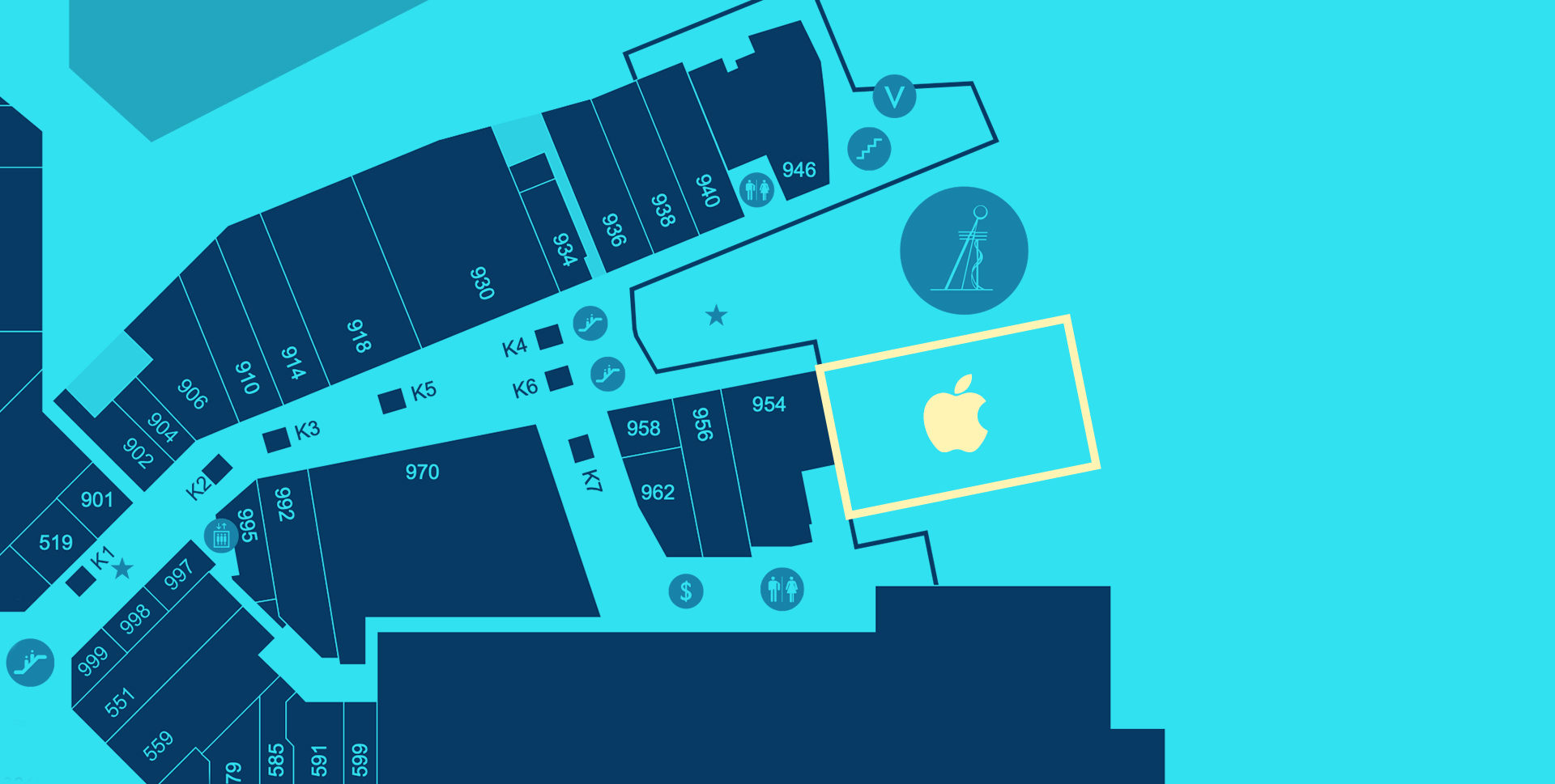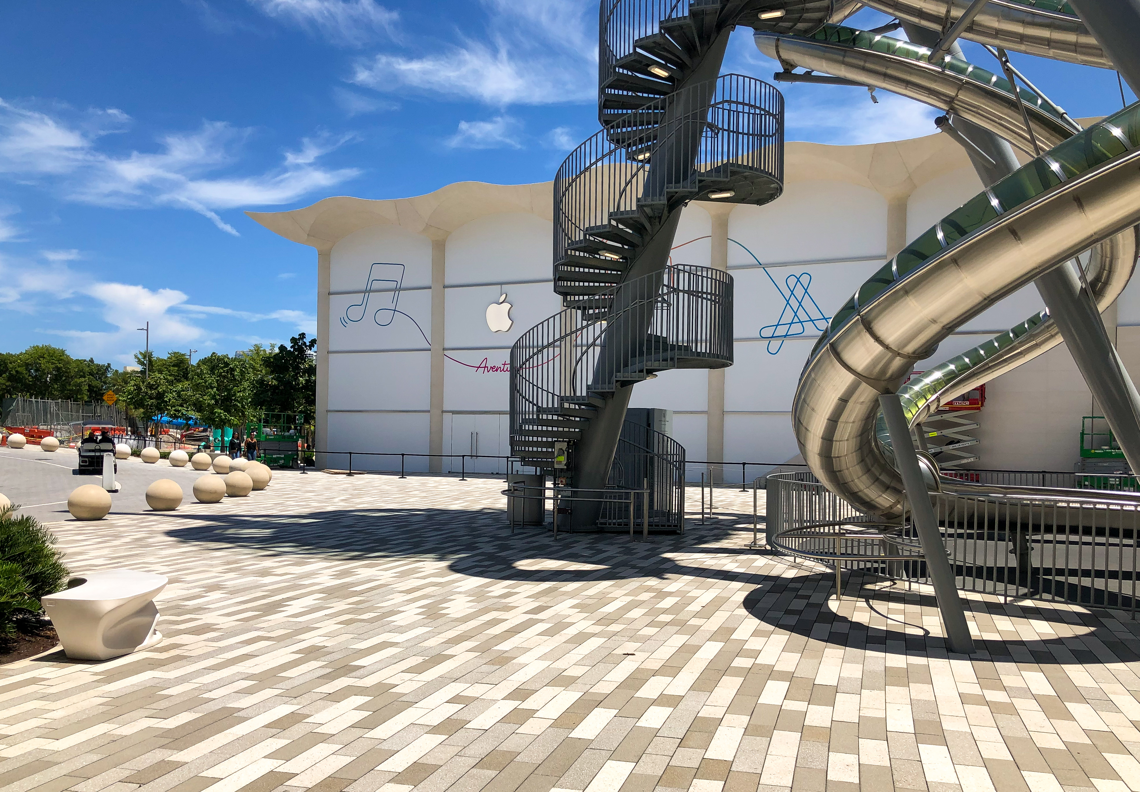 Located just north of Miami, Aventura Mall is the largest shopping center in Florida. Known for its extensive collection of large art installations, the mall opened a new wing in late 2017 featuring a 93-foot sculptural slide tower. Apple’s new space in the mall will sit at the foot of the slide and adjacent to the center’s entryway, which is surrounded by a manicured courtyard and a smorgasbord of international cuisine.