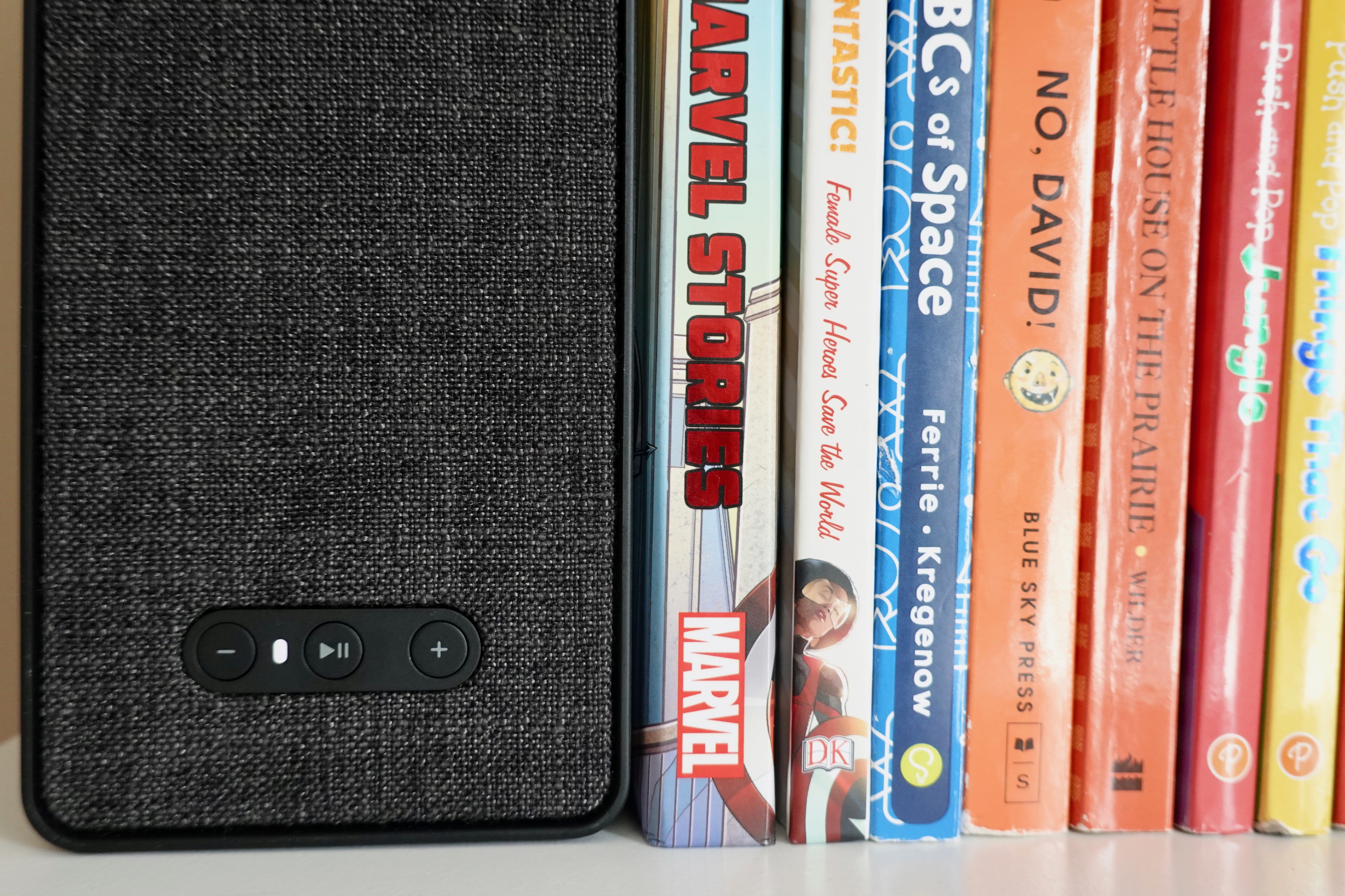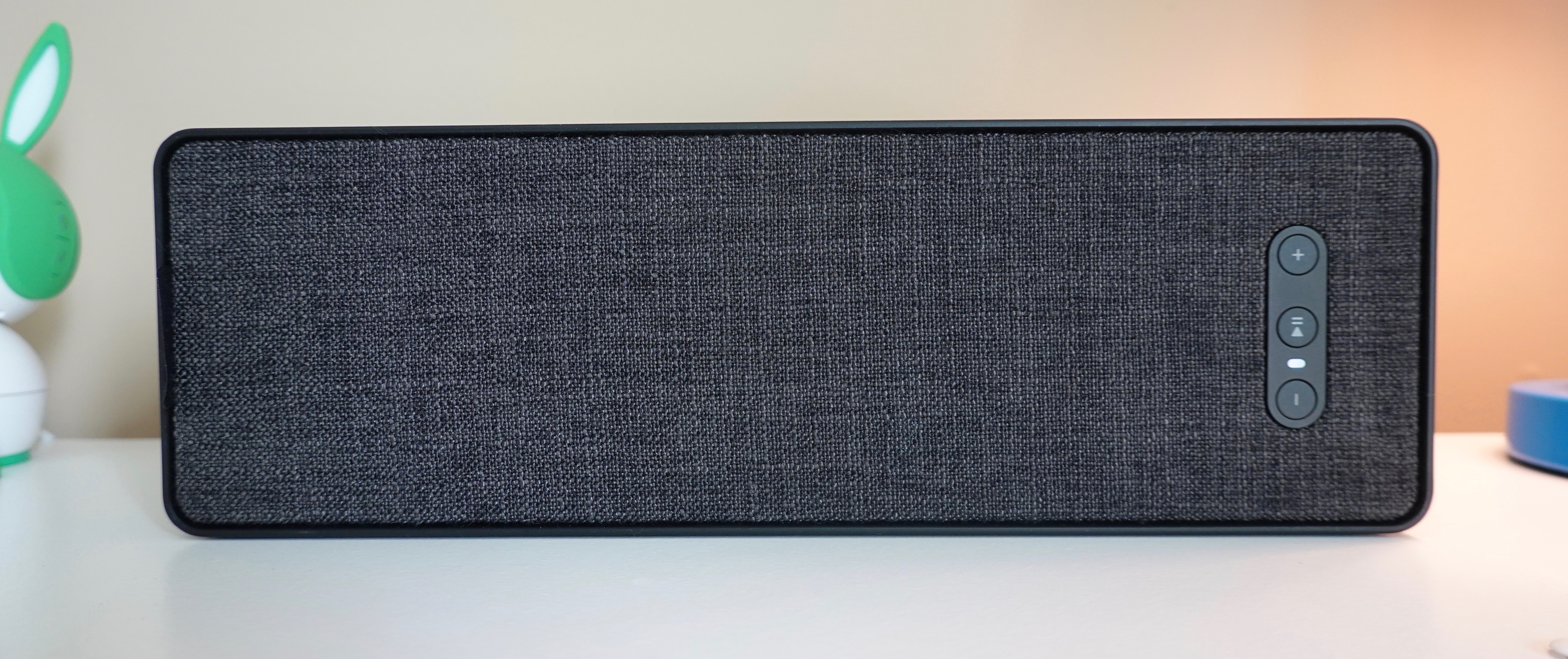 The base includes three buttons for controlling volume and playback below a status light that can be disabled through software. The speaker layer is hidden under a white or black soft fabric that wraps around all sides.