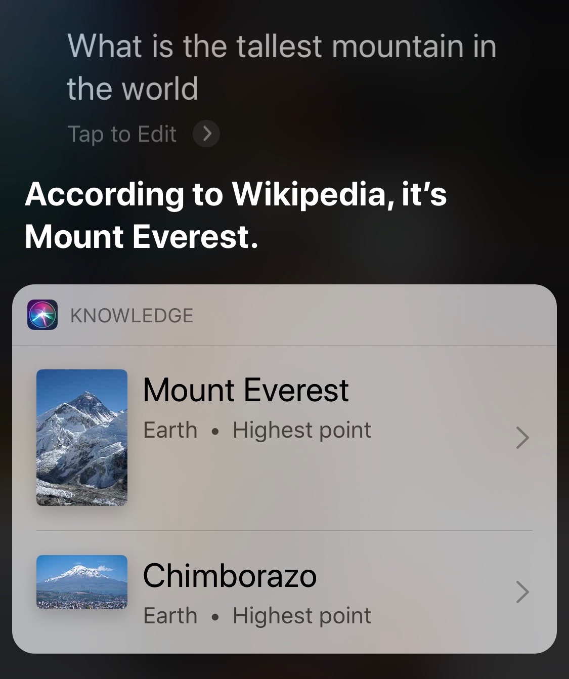 You can see this understanding in action by asking Siri a question like “what is the tallest mountain in the world?”