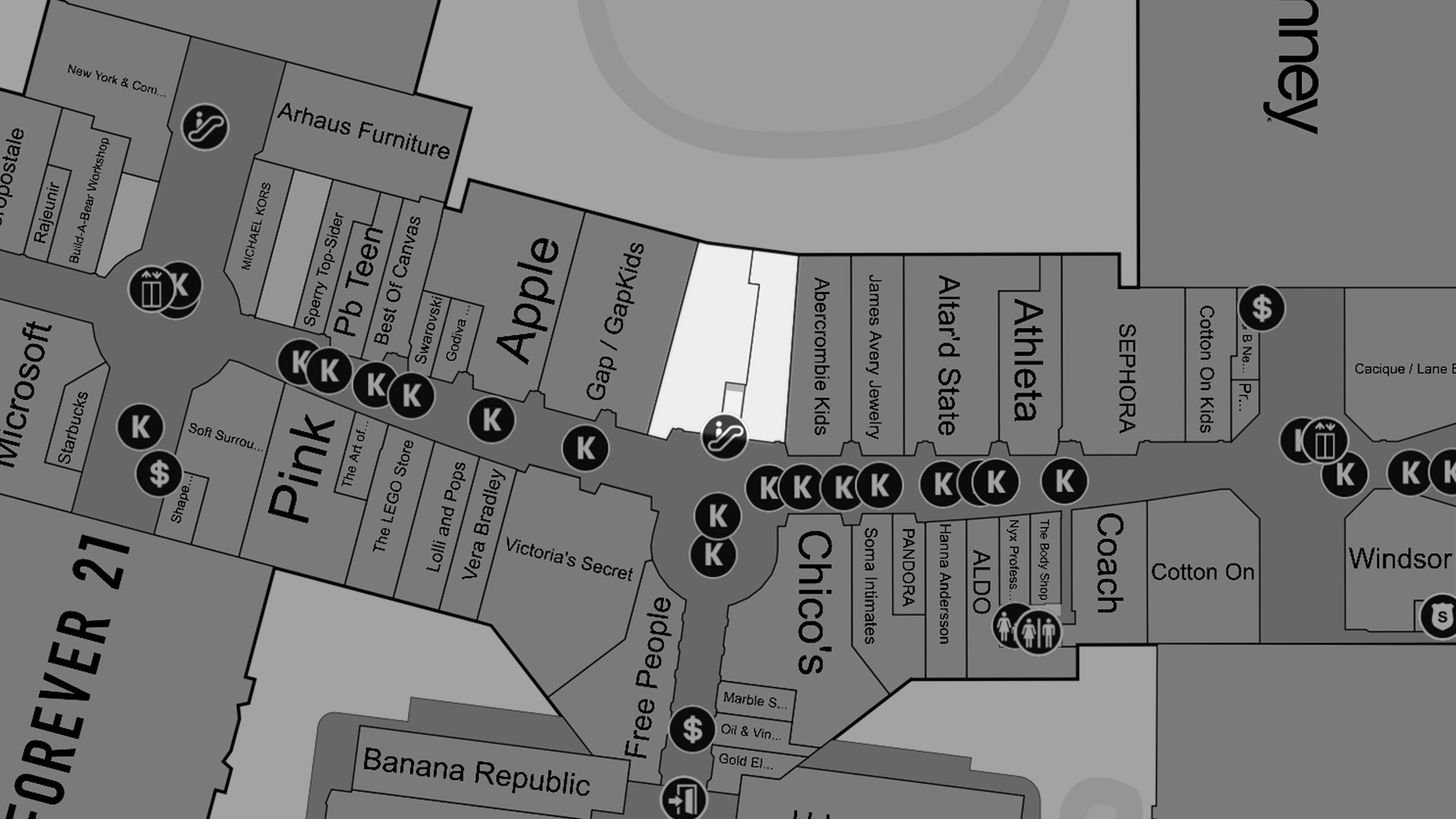 At The Woodlands Mall, Apple has secured a prime storefront just inside the main entryway. Early this year, an escalator was relocated and two tenant spaces were merged to create one wide entrance for the new store. Apple’s outgoing store two doors away opened in July 2005 with a narrow facade and a classic design.