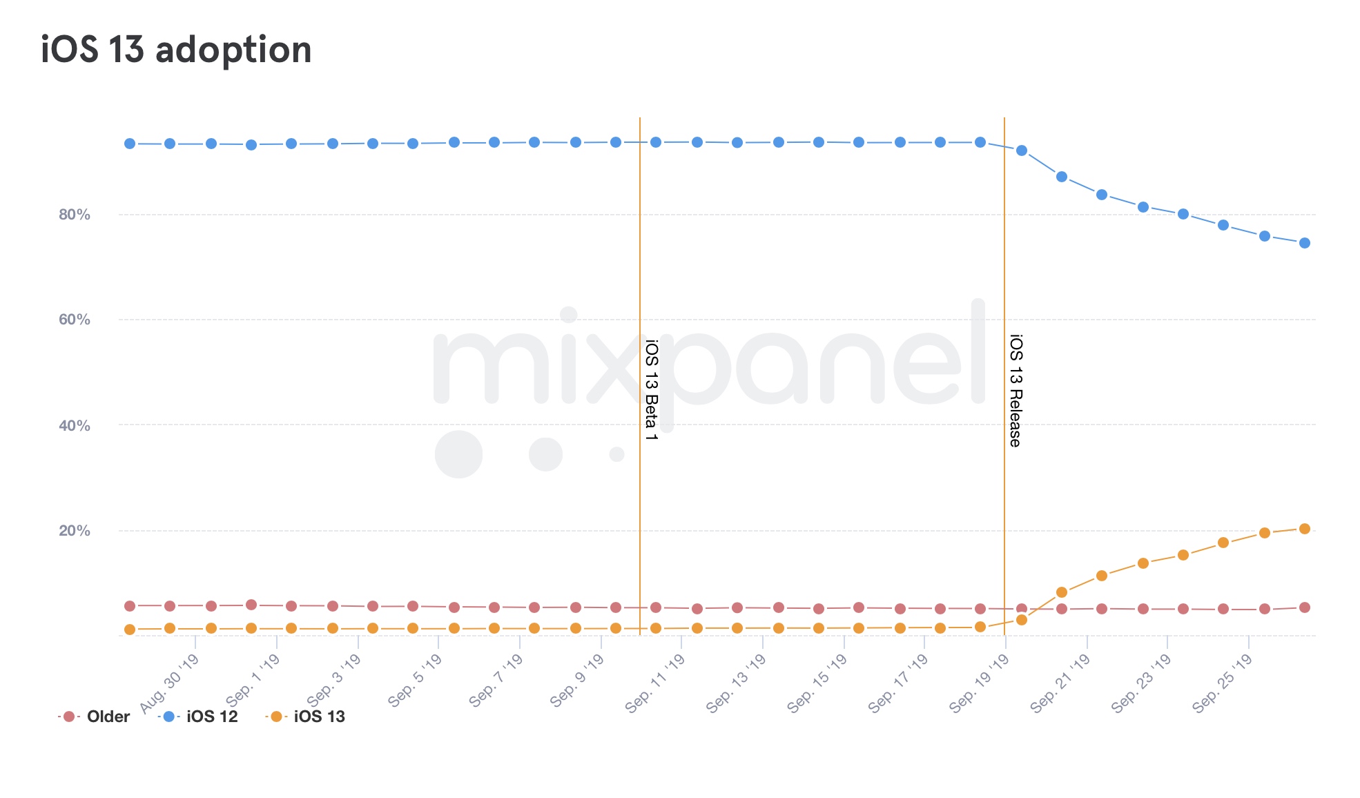 Apple released iOS 13 on September 19, exactly a week ago, and it seems to be off to a good start. According to data from Mixpanel, iOS 13 today crossed the 20% adoption mark.