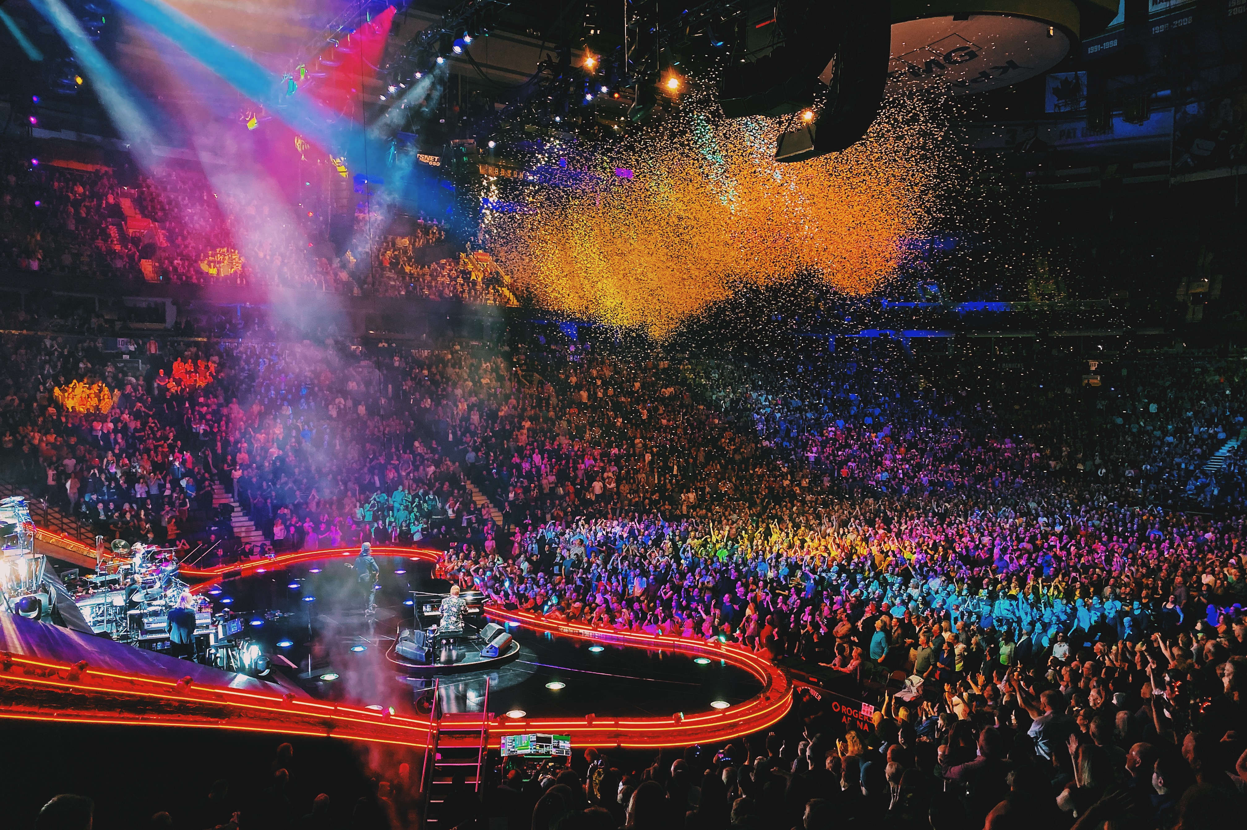The shot not only frames the legendary Sir Elton John at his piano. It fully captures the wave of people witnessing one of his final performances on the road under the light show and confetti drop that paints the audience.