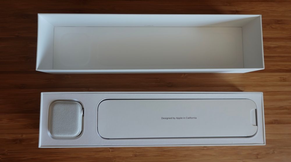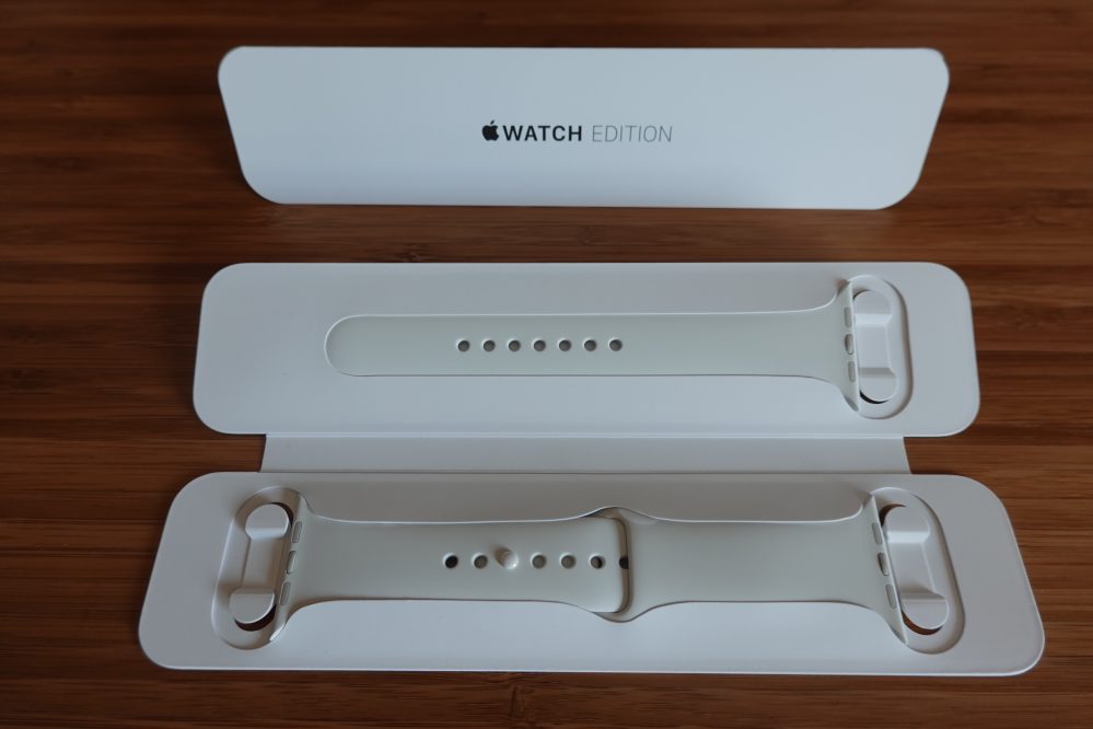 Apple Watch Edition tucks the bundled Sport band in the main box and includes both small/medium and medium/large straps (despite ‘What’s in the Box‘ suggesting S/M for 40mm and M/L for 44mm).