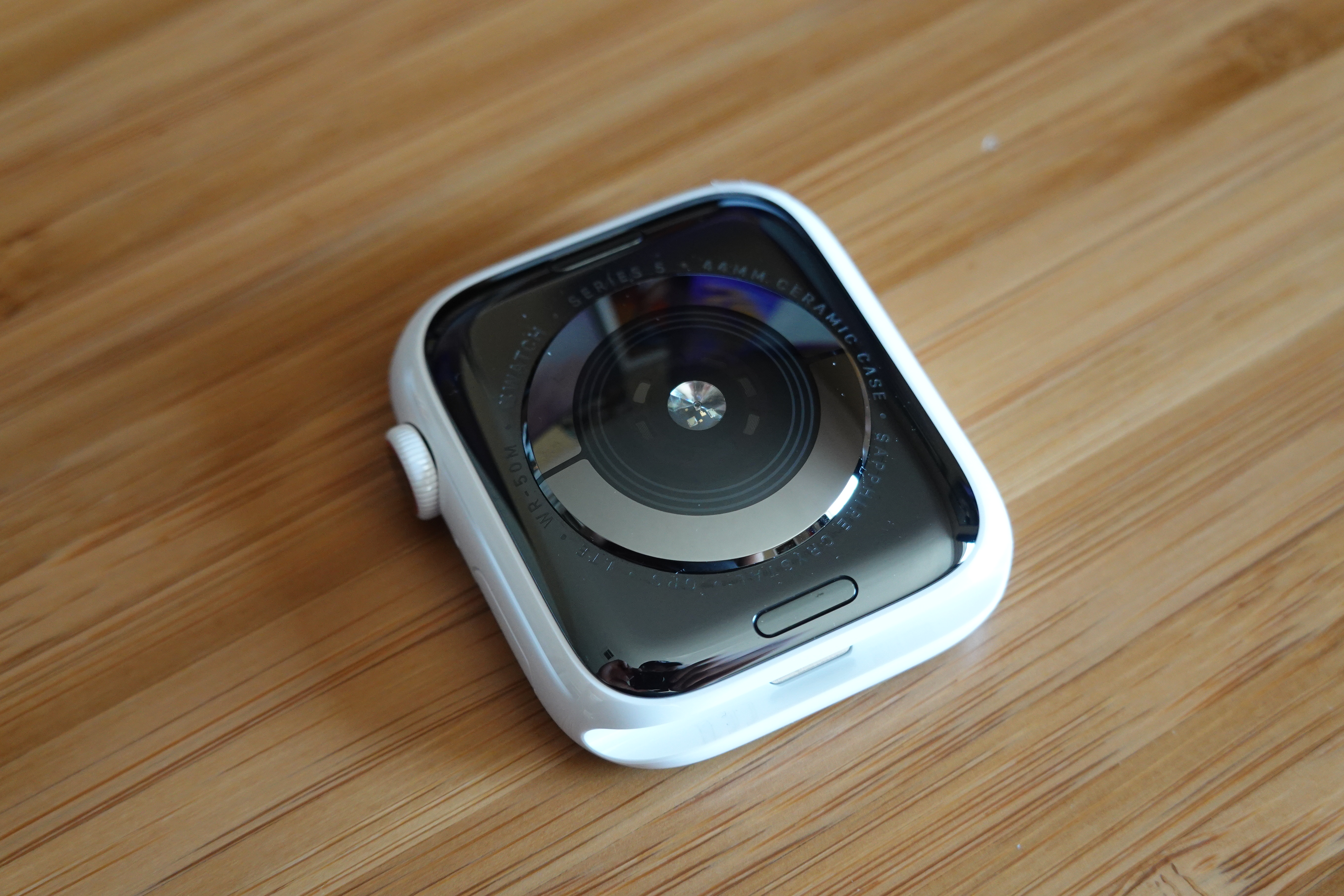 The back cover shifted from aluminum and steel to all ceramic starting with Apple Watch Series 4, and that continues with Apple Watch Series 5. The back back cover blends with the dark-colored optical heart rate sensor on all Series 4 and Series 5 watches, creating a strong contrast with the white ceramic finish.