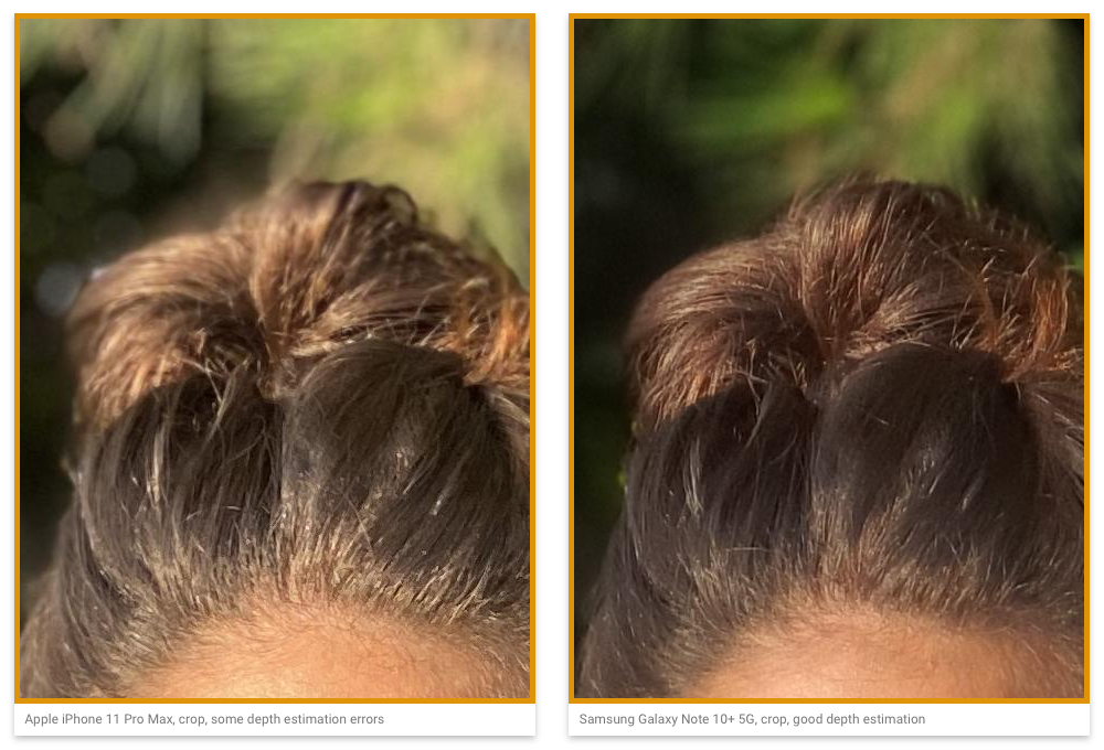 The synthesized bokeh effect was deemed not as good as the leading Android phone makers due to depth estimation errors around the subject’s hair.