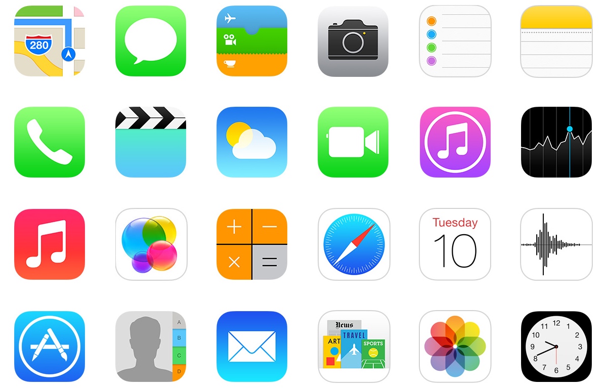 If iOS 6 had tread too far towards realism, we reflect on iOS 7 as being too far in the opposite direction. It was extreme sanitisation of Apple’s software UIs. App interfaces were reduced to simple white chrome with minor splashes of color to suggest interactivity. Icons in toolbars became clinically angular 1px stroked glyphs, and the home screen app icons were reduced to simple geometric shapes and background gradients. Buttons no longer looked like buttons, they looked like webpage links. You had to be Sherlock Holmes to find a drop shadow anywhere in the system, a dramatic departure from the previous versions where nearly every UI element had some combination of shadow, gloss, or emboss effect applied to them.