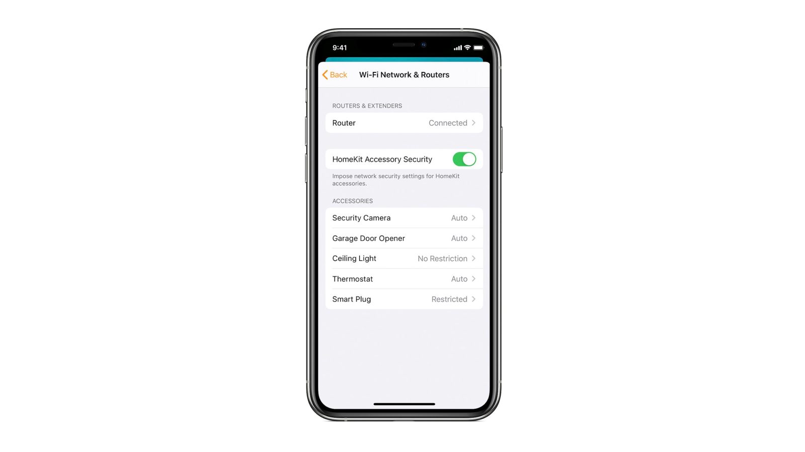 After setup, add your HomeKit accessories to the Home app. If you already have HomeKit accessories added to the Home app, they will continue to work and benefit from most HomeKit network protection features. For even more security, remove and reset your Wi-Fi accessories then add them back to the Home app. This creates a unique passkey known only to the router and each accessory.