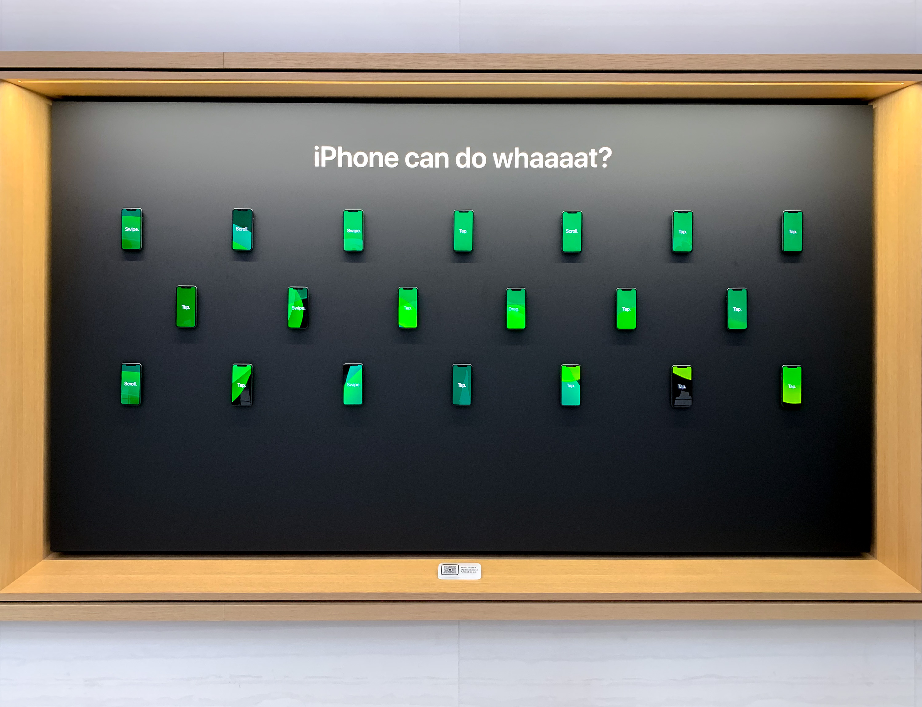 Each of twenty iPhones mounted on a black backdrop highlights a different advantage of iPhone hardware or software. Synchronized animated video loops invite store visitors to tap and swipe to learn more. “Go from photo to video in an instant,” reads one iPhone. “Set better screen time habits,” offers another.