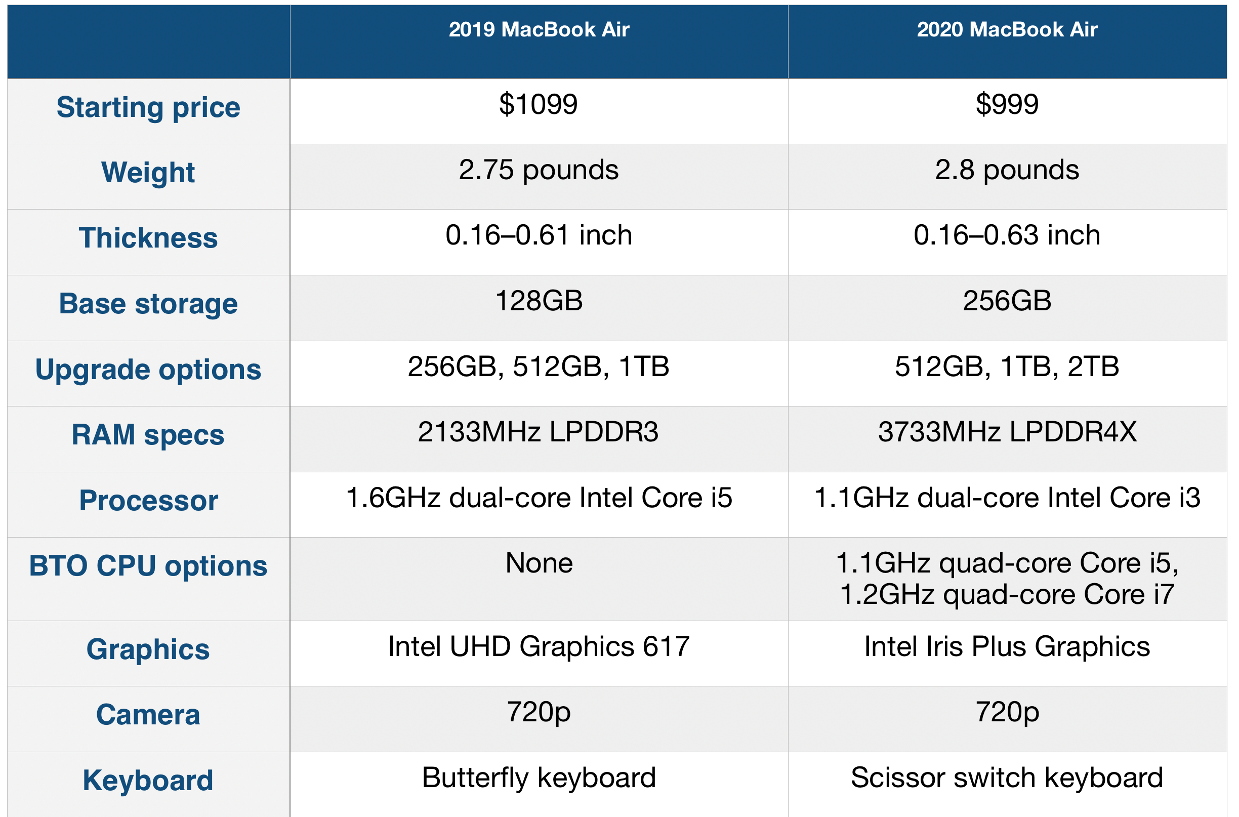 Last but not least, Apple has adjusted the pricing structure of the 2020 MacBook Air. Whereas the 2019 model started at $1,199, the the new model starts at $999. Here’s what this year’s base configuration gets you compared to last year: