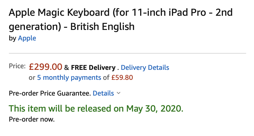 Now, if you look on the Amazon US site, a date is not specified. If you look on Amazon in other countries, like the UK listing for the Magic Keyboard, it suggests a May 30 release date. Do not put any faith in this date. Amazon placeholder listings are very common and almost never have early information on availability. Given the coronavirus disruption to the supply chain, it’s unlikely that even Apple has decided on the exact release date for the product at this time.