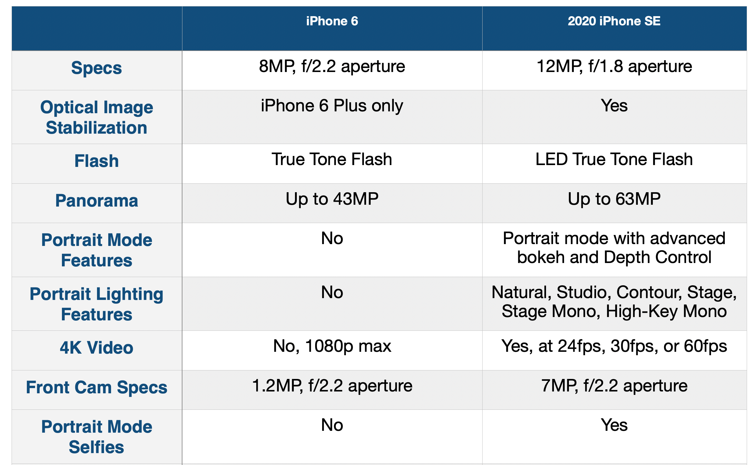 The iPhone SE also features numerous enhancements to the camera hardware. Here’s a comparison chart that highlights what’s different: