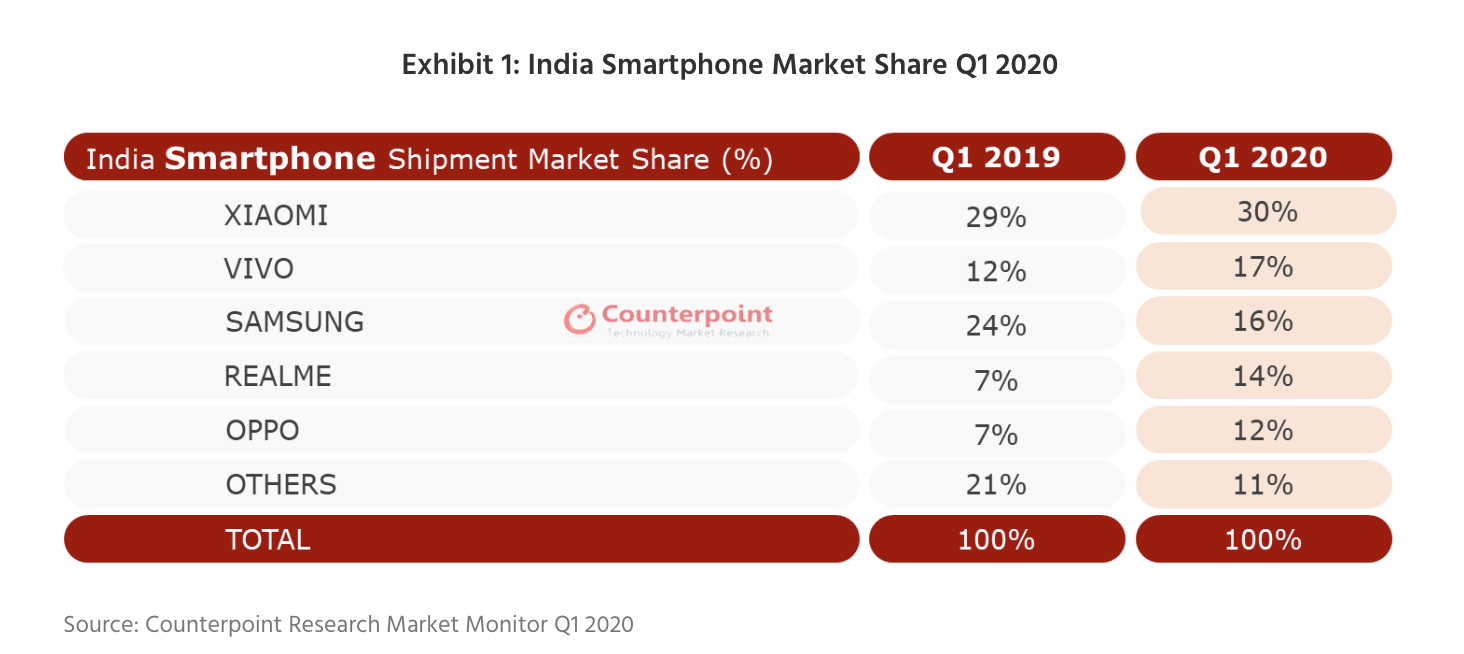 For Apple specifically, Counterpoint Research indicates that Apple was the third-fastest growing band during the quarter in India, thanks to 79% growth. realme grew 119% YoY in Q1 2020, while OPPO shipments grew 83%.